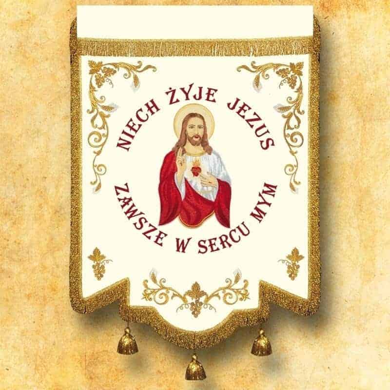 The embroidered banner featuring the Sacred Heart of Jesus is crafted from durable jacquard fabric and finished with golden fringes and detachable tassels, which lend it elegance and liturgical nobility. Solid stitching, precise details, and high-quality materials guarantee aesthetics and resistance to intensive, long-term use. This is a unique element of church furnishings that highlights the solemn character of the celebration and introduces an atmosphere of focus, prayer, and spiritual unity of the entire parish community.