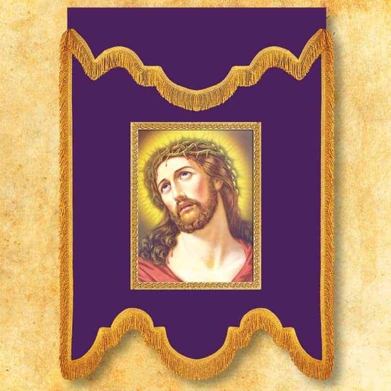Purple mourning bannerFabric: 100% Elana, trimmed with gold fringe and gold trimmings around the image.Size: 90cm x 125cm