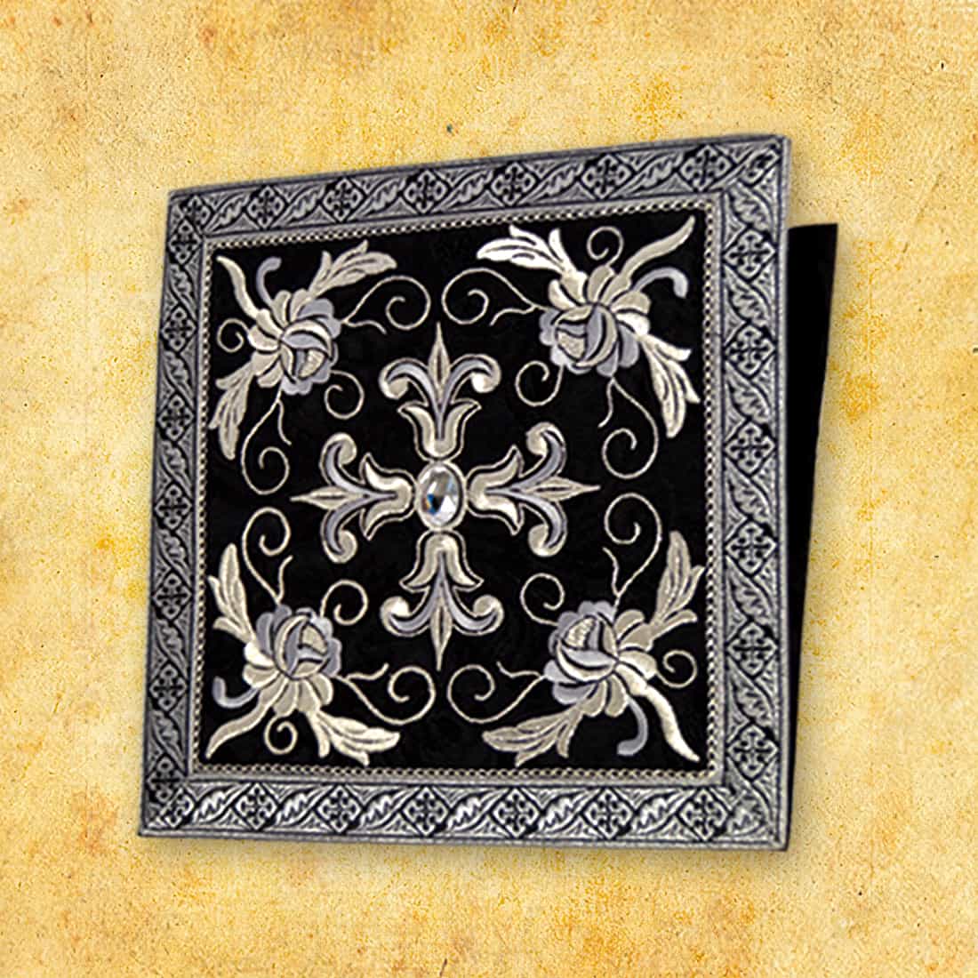 The embroidered “Massimo-Nero” bursa is an elegant and unique piece of liturgical equipment, made of high-quality black fabric. Decorated with rich silver embroidery featuring a classic cross pattern and floral motifs, it symbolizes solemnity, prayer, and spiritual depth. Its contrasting colors give it a unique elegance and dignified character.