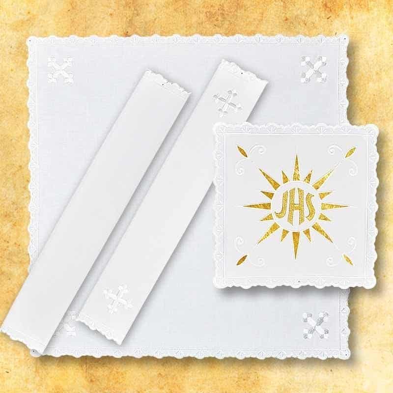 Purificator and towel made of snow-white cotton canvas, highly absorbent, 100% cotton. Paten cloth and corporal made of our white, stain-resistant tablecloth fabric.nPallium with openwork embroidery and gold stiffening in the middle.Pallium size: 20cm x 20cmCorporal size: 45cm x 45cmPurificator size: 23cm x 45cmHand towel size: 23cm x 45cm
