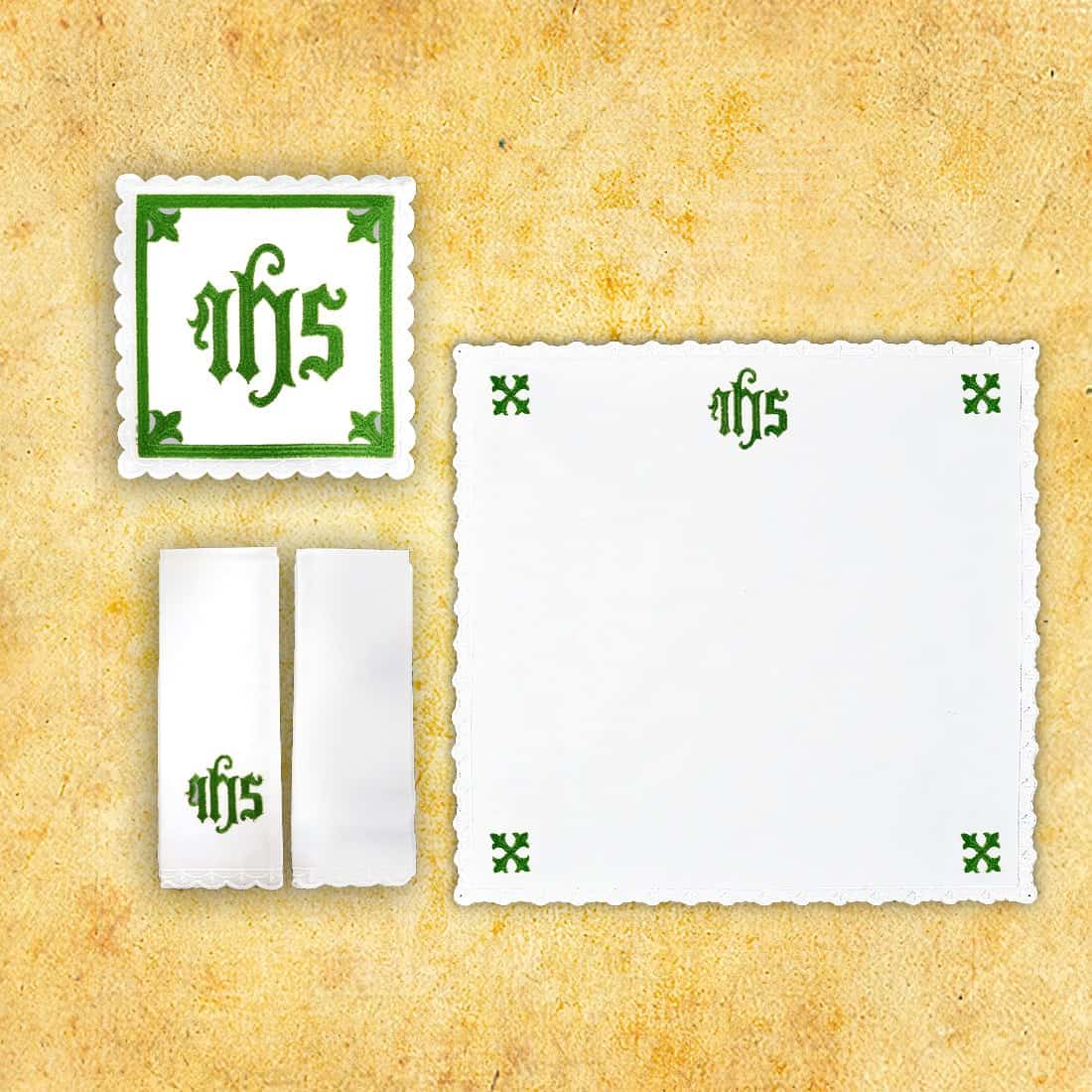 The chalice linens from the Cathedral embroidered set are made of the highest quality fabrics. The embroidered pallets and embroidered corporals are made of white stain-resistant tablecloth fabric. The embroidered towels and embroidered purificators are made of snow-white, water-absorbent linen.