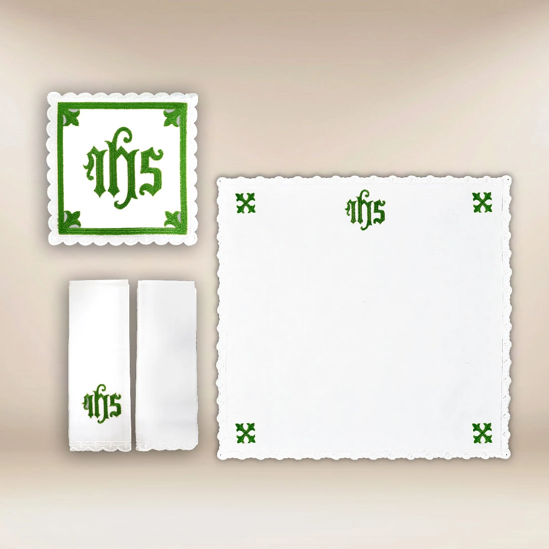 The set consists of an embroidered pall, an embroidered corporal, a purificator, and a small towel, creating a complete and functional set for the altar chalice. The central decorative motif is the IHS monogram, clearly referring to the name of Jesus Christ and the mystery of the Eucharist. The harmonious arrangement of the embroidery gives the whole a balance and order characteristic of the classical cathedral style.
