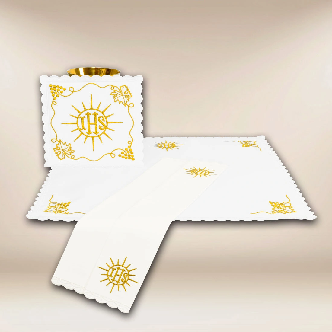 The main decorative element is the IHS monogram, surrounded by rays of light, symbolizing the presence of Christ in the Most Holy Sacrament and His saving power. Additional subtle ornaments placed on the remaining elements of the set create a coherent and harmonious composition, maintaining a balance between decorativeness and liturgical solemnity.