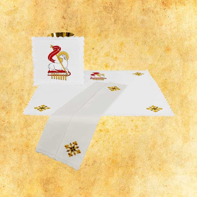 The embroidered pall and embroidered corporal are made of white stain-resistant tablecloth fabric. The embroidered purificator and embroidered towel are made of snow-white, water-absorbent linen. The embroidered chalice linen forms a coherent whole with the other elements of the Agnus Dei set.