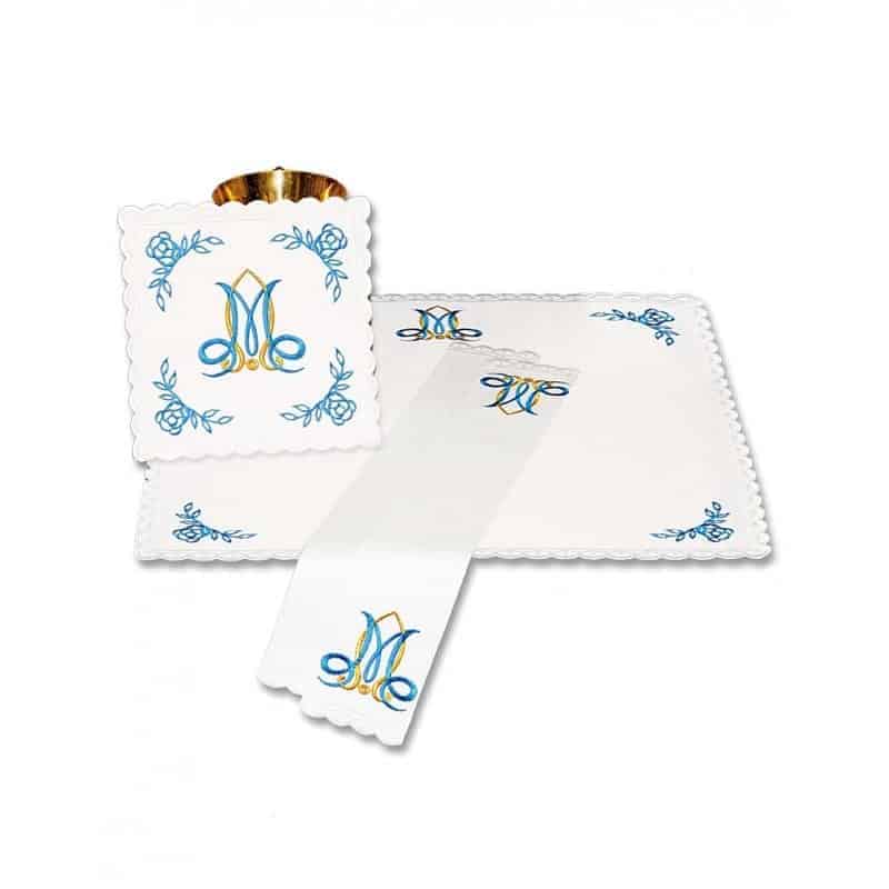 Embroidered chalice linens “Mary’s Blue” The presented set of chalice linens “Mary’s Blue” is made of the highest quality materials, ensuring elegance and durability.nThe embroidered purificator and embroidered corporal are made of white, stain-resistant 100% polyester tablecloth fabric.The embroidered towel and embroidered purificator are made of snow-white canvas with excellent absorbency.The “Mary’s Blue” liturgical set combines functionality with beautiful, sacred decoration, making it an essential piece of altar equipment during the celebration of Holy Mass.