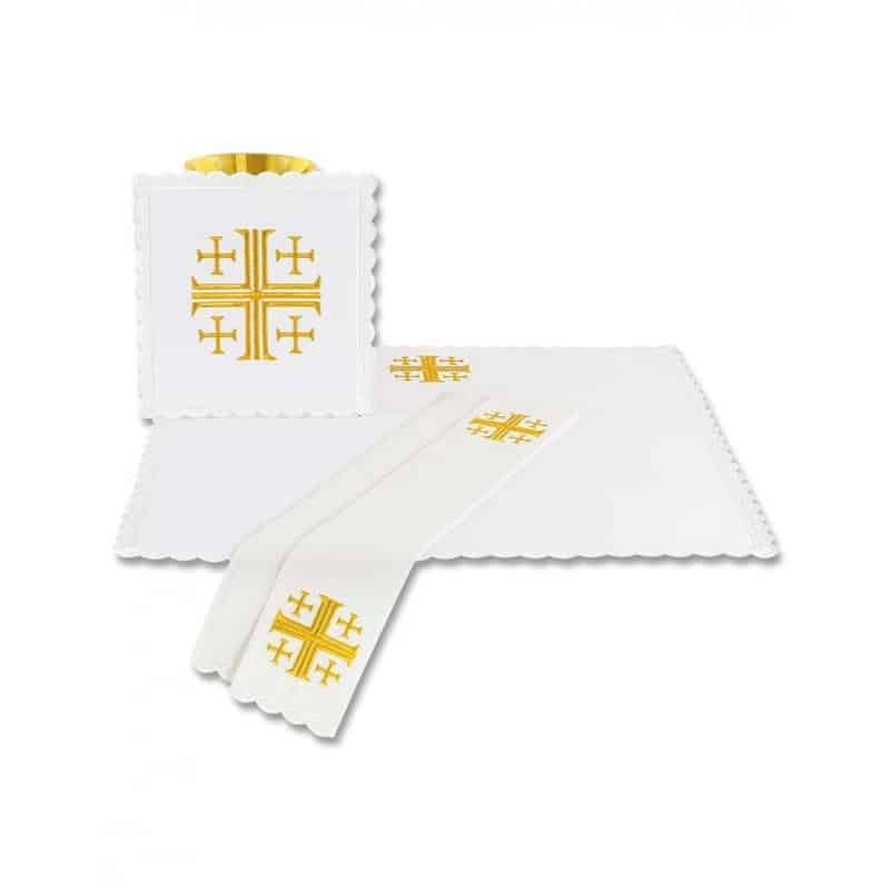 The chalice linens offered are made of the highest quality fabrics. The embroidered purificator and embroidered towel are made of snow-white, highly absorbent linen. The embroidered corporal and embroidered pall are made of white stain-resistant tablecloth fabric.