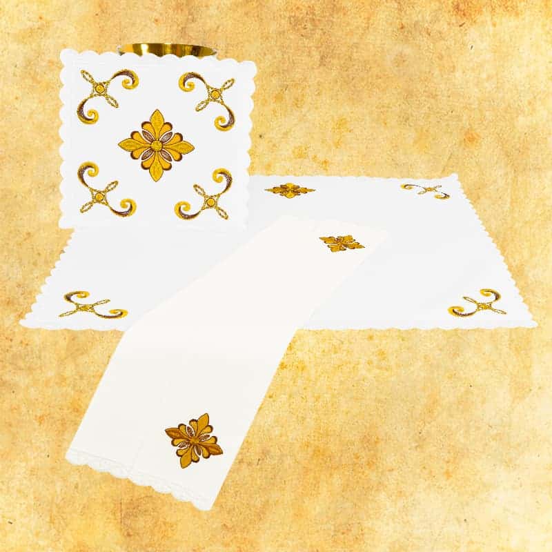 Gaudete chalice linensFabrics:- 100% cotton (purificator + towel)- 100% polyester (corporal + pallium)Color: whiteWe also offer embroidered:- covers(95×95; 110×110)-lecterns-can dresses-lace-tablecloths (by the meter)-napkins (32×32)Washing: Recommended washing in an automatic washing machine at 30 degrees, without fabric softeners.