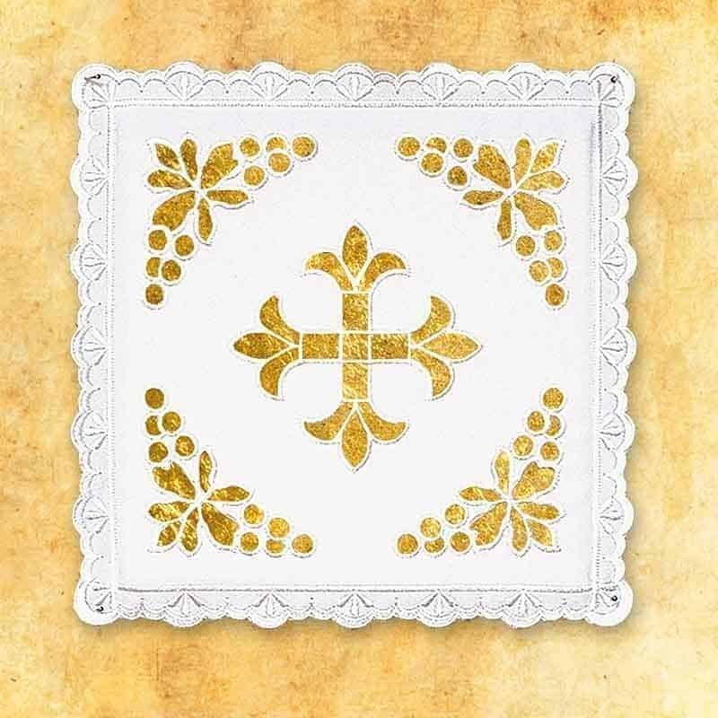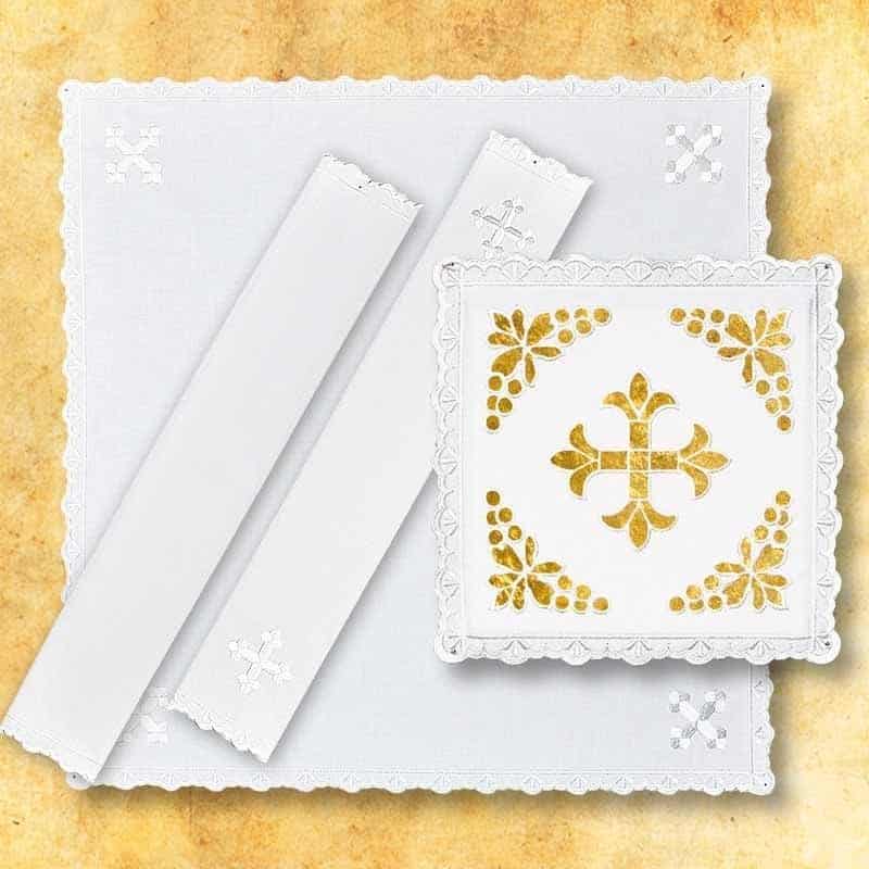Purificator and towel made of snow-white cotton canvas, highly absorbent, 100% cotton.nThe palka has openwork embroidery and is stiffened in the middle with gold-colored material.Palka size: 20cm x 20cmKorporał size: 45cm x45cmPuryfikaterz size: 23cm x 45cmTowel size: 23cm x 45cm