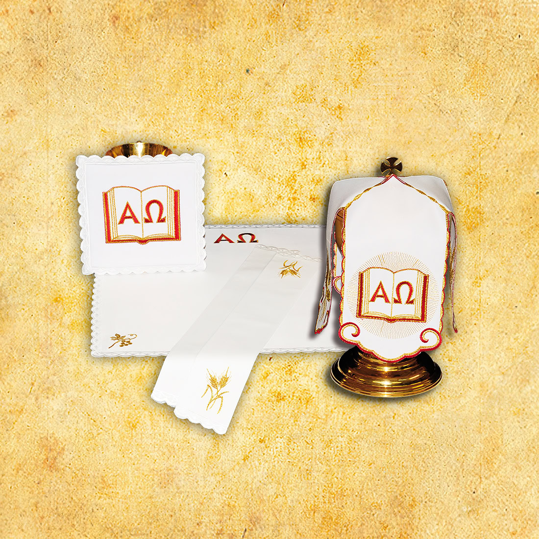The chalice linens and ciborium cover are made of the highest quality fabrics.The embroidered purificator and embroidered towel are made of snow-white, highly absorbent canvas. The embroidered corporal, embroidered pall, and ciborium cover are made of white stain-resistant tablecloth fabric.