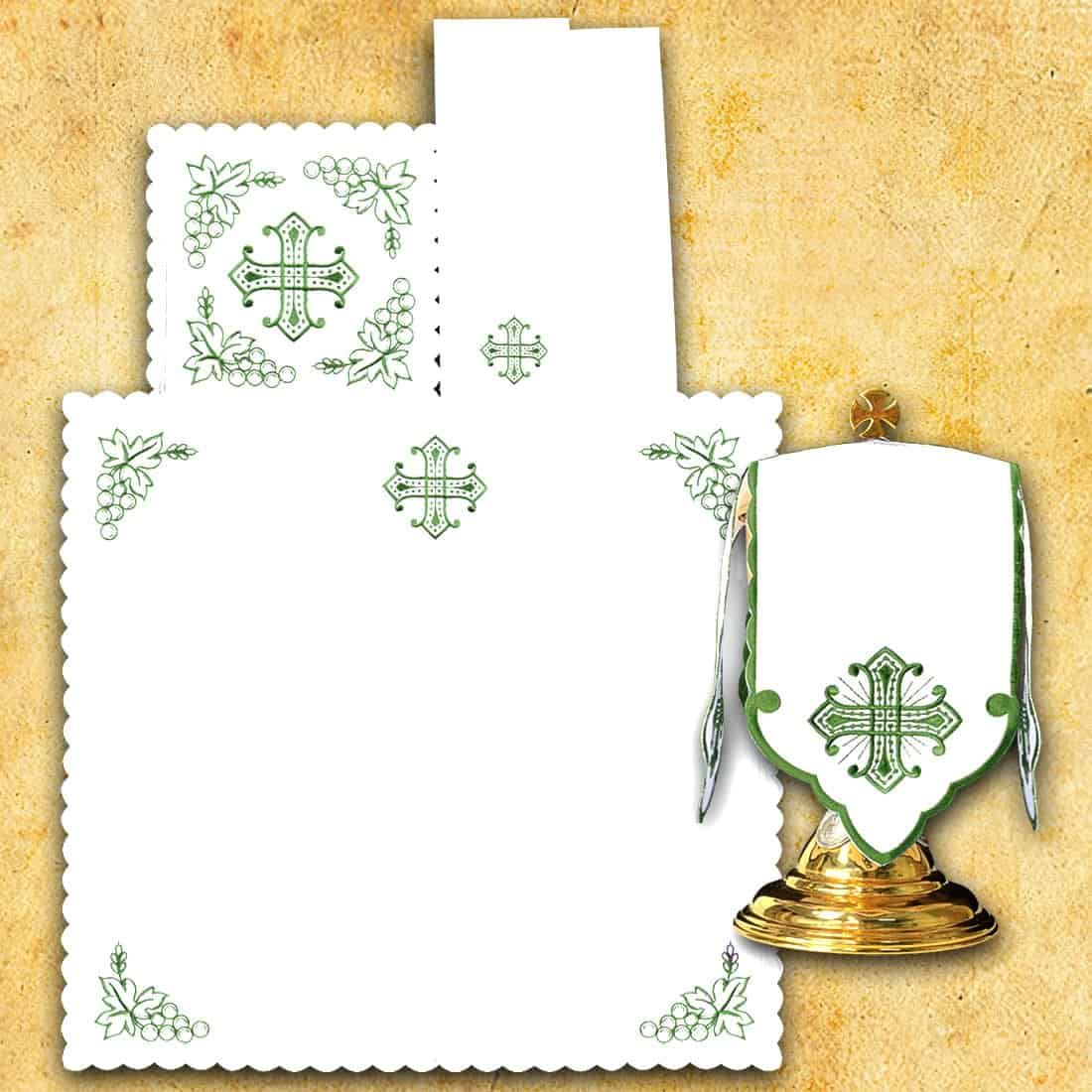 The chalice linen and tabernacle dress from the Calvario embroidered set are made of the highest quality fabrics.The embroidered napkins, embroidered corporals, and chasubles are made of white stain-resistant tablecloth fabric. The embroidered towels and embroidered purificators are made of snow-white, highly absorbent linen.