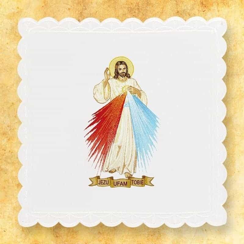 Set of embroidered chalice linens “Jesus, I Trust in You” with a veil, made of the highest quality liturgical fabrics.The pall, corporal, and veil are made of white, stain-resistant 100% polyester tablecloth fabric, guaranteeing durability and elegance.The towel and purificator are made of snow-white canvas with excellent absorbency.The whole set is decorated with embroidery and an image of the Merciful Jesus made using the thermosublimation method.The set combines the beauty of sacred decorations with functionality, making it an essential element of altar furnishings during the celebration of the Eucharist. NOTE: Jesus on the corporal, fingers, and vestment on the ciborium was made using thermosublimation technology; it is not embroidered.
