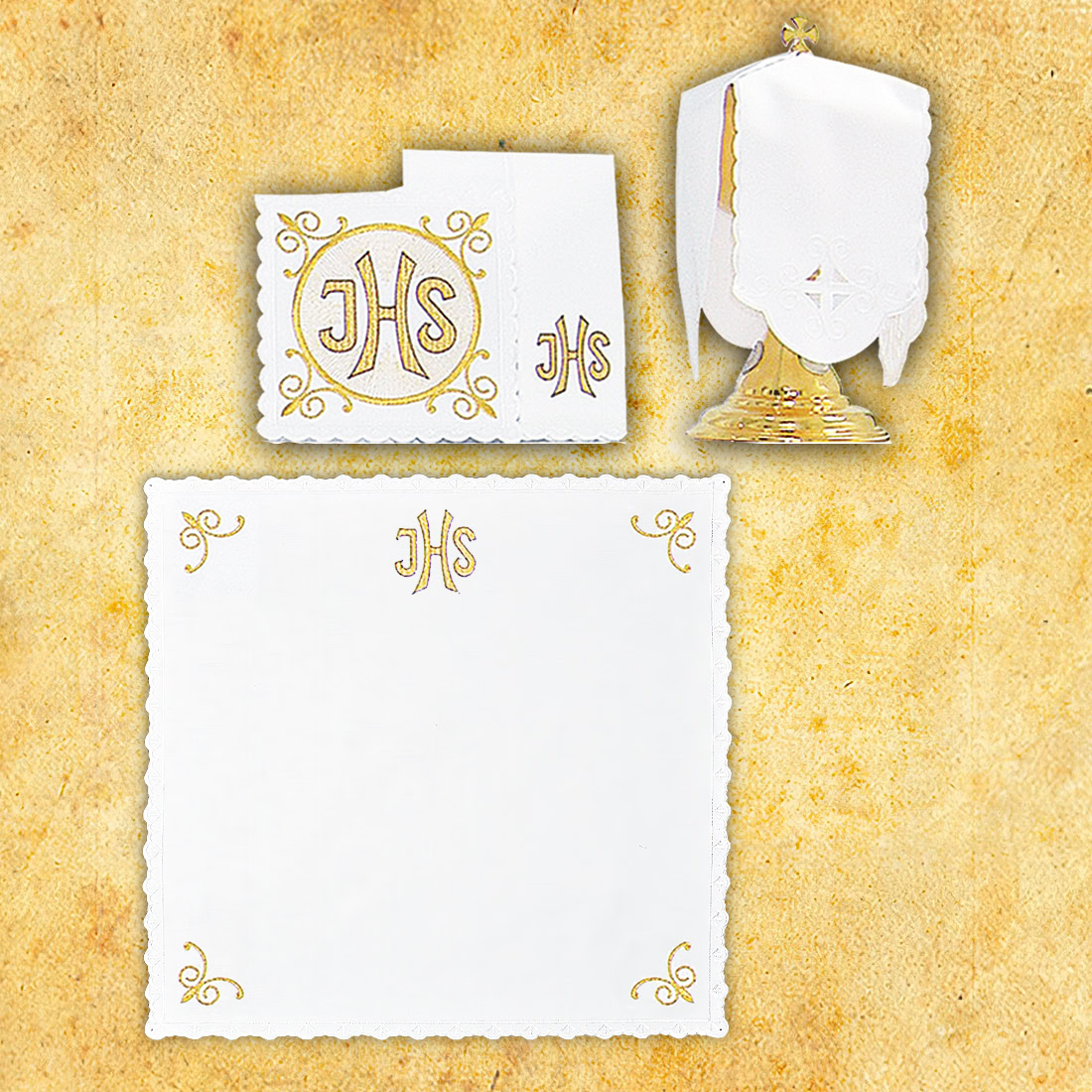 The chalice linens and ciborium cover are made of the highest quality fabrics.The embroidered purificator and embroidered towel are made of snow-white, highly absorbent canvas. The embroidered corporal, embroidered pall, and ciborium cover are made of white stain-resistant tablecloth fabric.