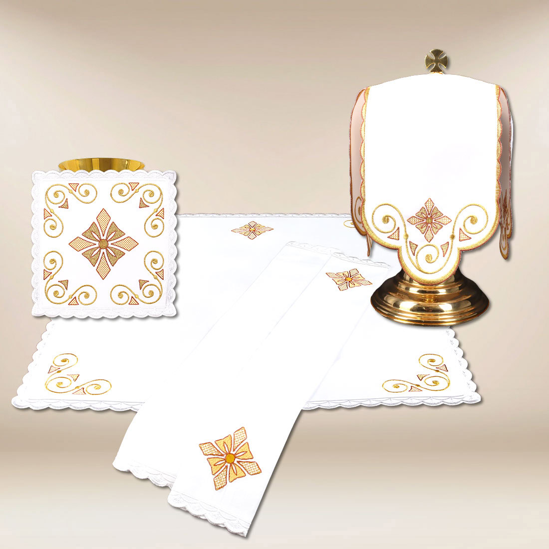 The set includes: an embroidered pall, an embroidered corporal, an embroidered purificator, an embroidered Manuterge and a Ciborium Veil. The purificator and Manuterge are made of 100% COTTON, which ensures very good absorbency and comfort of use in accordance with the requirements of the liturgy. The corporal, pall and ciborium veil are made of 100% polyester, which guarantees durability, aesthetic appearance and ease of care. The whole set is in a classic white colour, which emphasises the purity and solemn nature of the celebration.