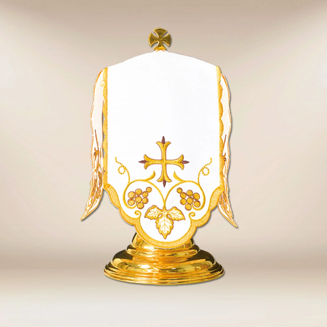 Ciborium Veil Cross has been designed as a liturgical cover for the Most Holy Sacrament, intended for daily use as well as solemn Eucharistic celebrations. Its classic form and balanced ornamentation ensure that it fits perfectly within the altar space, emphasizing the central place of the Eucharist in the life of the Church. The product combines functionality with the aesthetics characteristic of traditional sacred textiles.