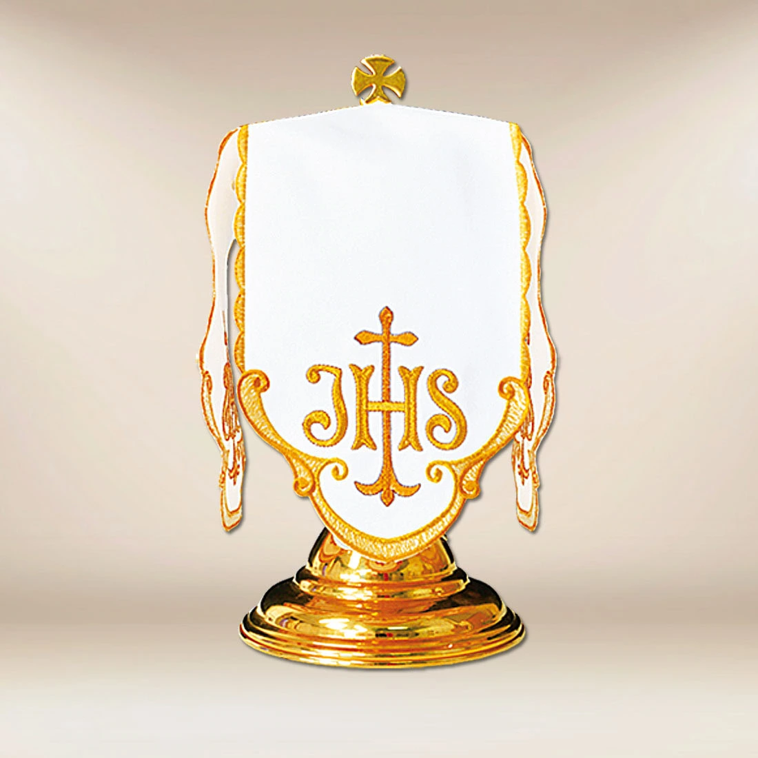 Embroidered ciborium veil featuring the IHS motif has been designed as a practical and aesthetic element of chalice linen, intended for the dignified covering of the eucharistic ciborium. Its classic form and subtle decoration ensure it fits perfectly within the daily liturgical space, emphasizing the sacred nature of the Eucharist.
