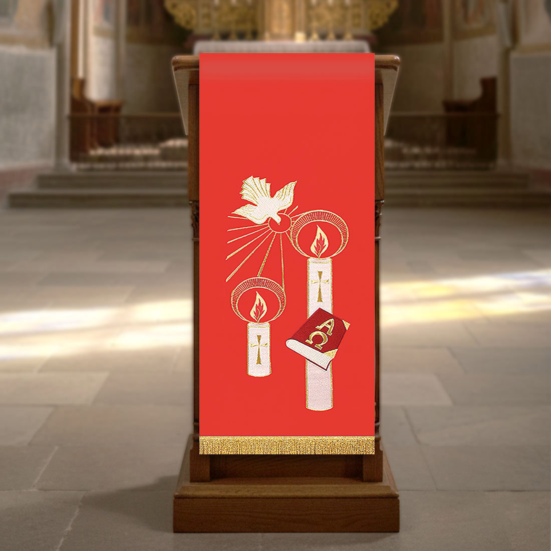 Embroidered Cover for Lectern Holy Spirit has been designed as a clear and symbolic adornment for the place of proclamation of the Word of God, especially during celebrations related to the presence and action of the Holy Spirit. Placed on the lectern, it attracts attention and directs the thoughts of the faithful towards the mystery of God’s power, which strengthens the Church and guides it through the ages. The classic dimensions of 55 cm x 150 cm ensure that the cover presents harmoniously and majestically in the presbytery space.