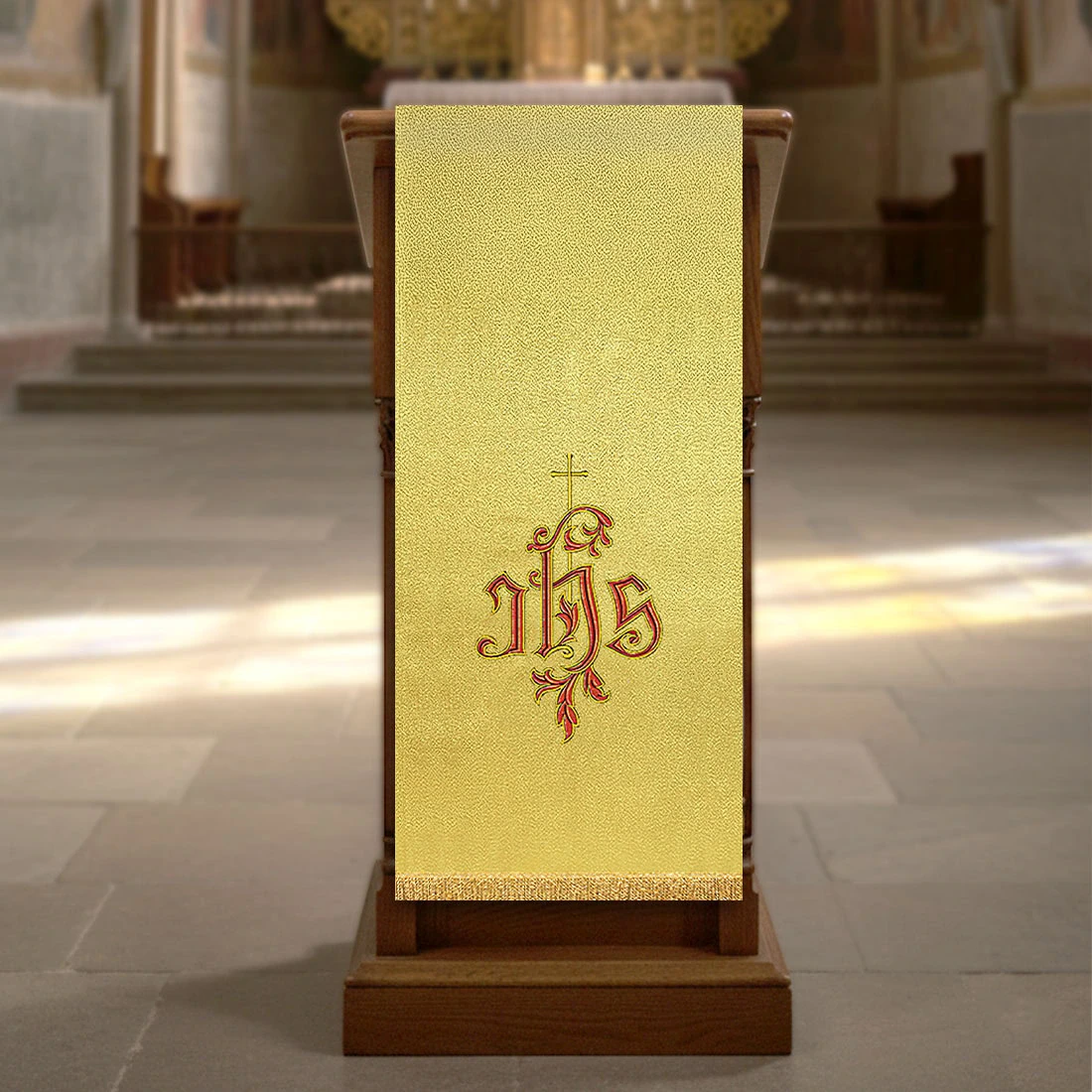 The central element of the decoration is the embroidered IHS monogram, topped with a cross, which unequivocally points to the name of Jesus Christ and the mystery of salvation. This motif has been present in sacred art for centuries as a sign of reverence for the Most Holy Sacrament. The delicately stylized form of the embroidery maintains a balance between decorativeness and liturgical solemnity, ensuring that the cover for lectern does not dominate the space but rather ennobles it.