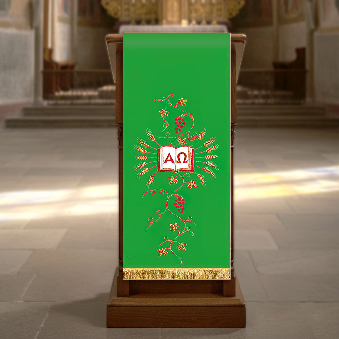 Embroidered Biblical Lectern Cover has been designed as a harmonious and elegant adornment for the place of proclamation of the Word of God. Placed on the lectern, it naturally draws the attention of the faithful to the Holy Scriptures, emphasizing its central role in the celebration of the liturgy. The classic format of 55 cm x 150 cm ensures that the lectern cover presents proportionately and aesthetically in both spacious churches and smaller chapels.