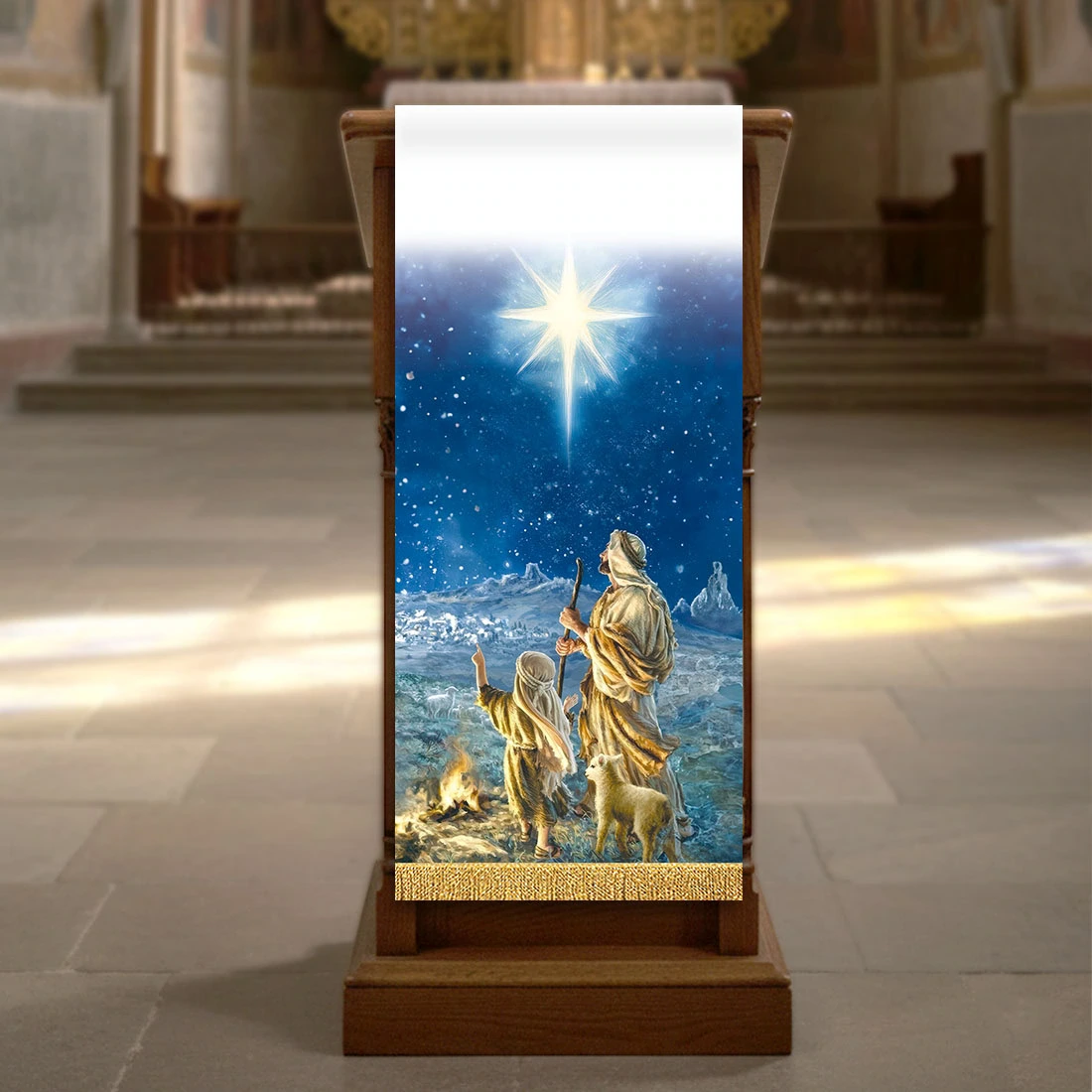 Christmas Printed Lectern Cover has been created with the intention of enhancing the liturgical celebration, where the image aids in entering the spiritual meaning of the event. The rich, realistic graphic depicts a peaceful night, a guiding star, and travelers paused before the mystery. Thus, the decoration serves as a quiet invitation to contemplation and prayer. Christmas Printed Lectern Cover beautifully complements other holiday textiles, creating a cohesive space around the lectern.