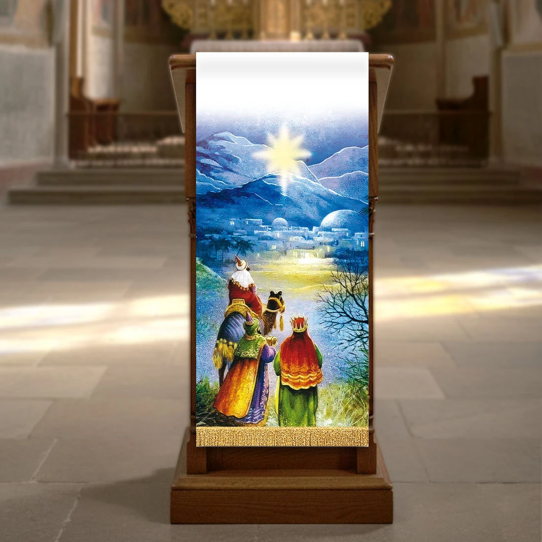 Printed Lectern Cover Three Kings is a beautiful liturgical decoration that tells the story of seeking and humble devotion. The scene of the wise men traveling by star reminds us that anyone who sincerely seeks God is led towards the light. Printed Lectern Cover Three Kings perfectly complements the festive decor of the church, bringing coherence and depth to the space around the lectern.