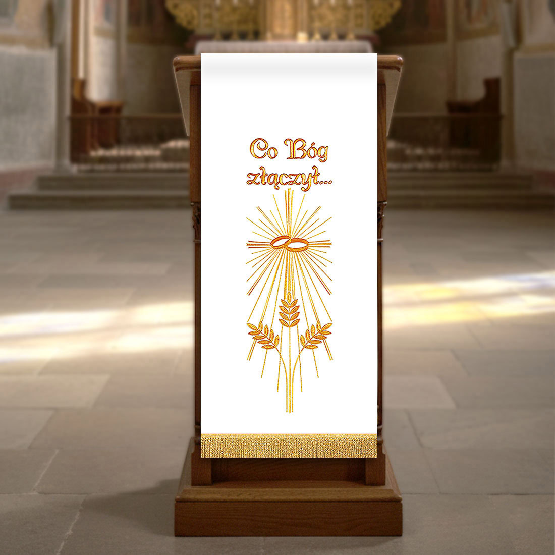 The cover is made of high-quality, smooth polyester fabric, resistant to stains and easy to care for – the product can be safely washed and ironed. The lower edge is adorned with attached golden fringes, which give the decoration a festive, solemn character. Embroidered Cover for Lectern for Sacraments is perfect for weddings, wedding anniversaries, and thanksgiving services, bringing elegance and deep symbolism to the church space.