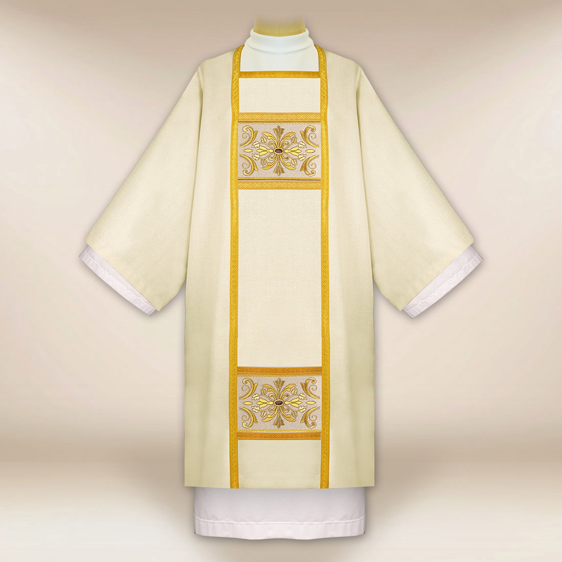 Each ecru embroidered dalmatic is made in the Urbanowicz Embroidery Polska workshop, where the tradition of liturgical craftsmanship is combined with precision workmanship. Carefully executed embroidery, durable threads and precise finishing ensure that the vestment retains its representative appearance for many years.