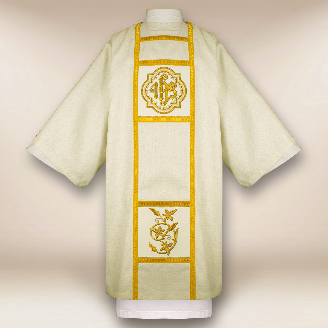 Each ecru embroidered dalmatic with IHS is made in the Urbanowicz Embroidery Polska workshop, where the tradition of liturgical craftsmanship is combined with precision workmanship. Carefully executed embroidery, durable threads and precise finishing ensure that the vestment retains its representative appearance for many years.