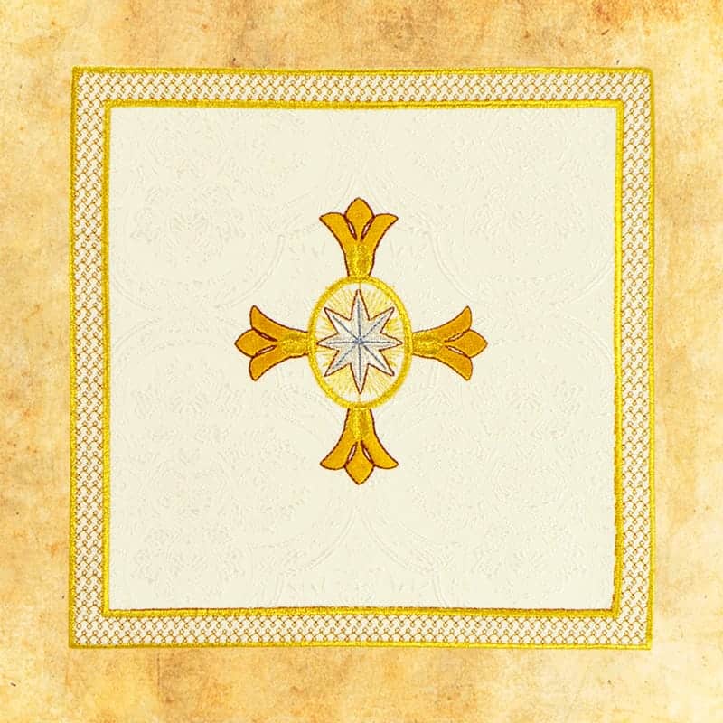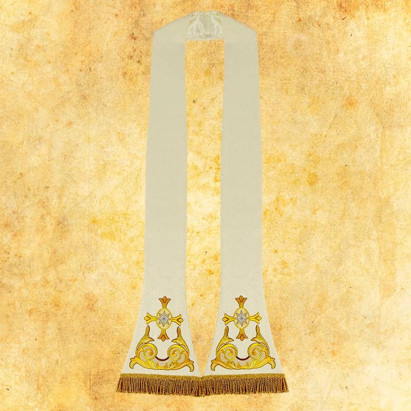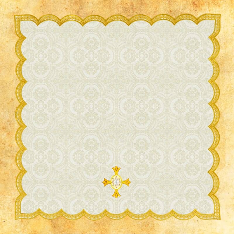 The set is made of high-quality jacquard fabric. The fabric is very pleasant to the touch with a subtle sheen.nThe chasuble is lightweight, stiffened with soft non-woven fabric. Lined with satin in the same color.The set consists of a chasuble, stole, maniple, veil, and bursa.One size fits all.