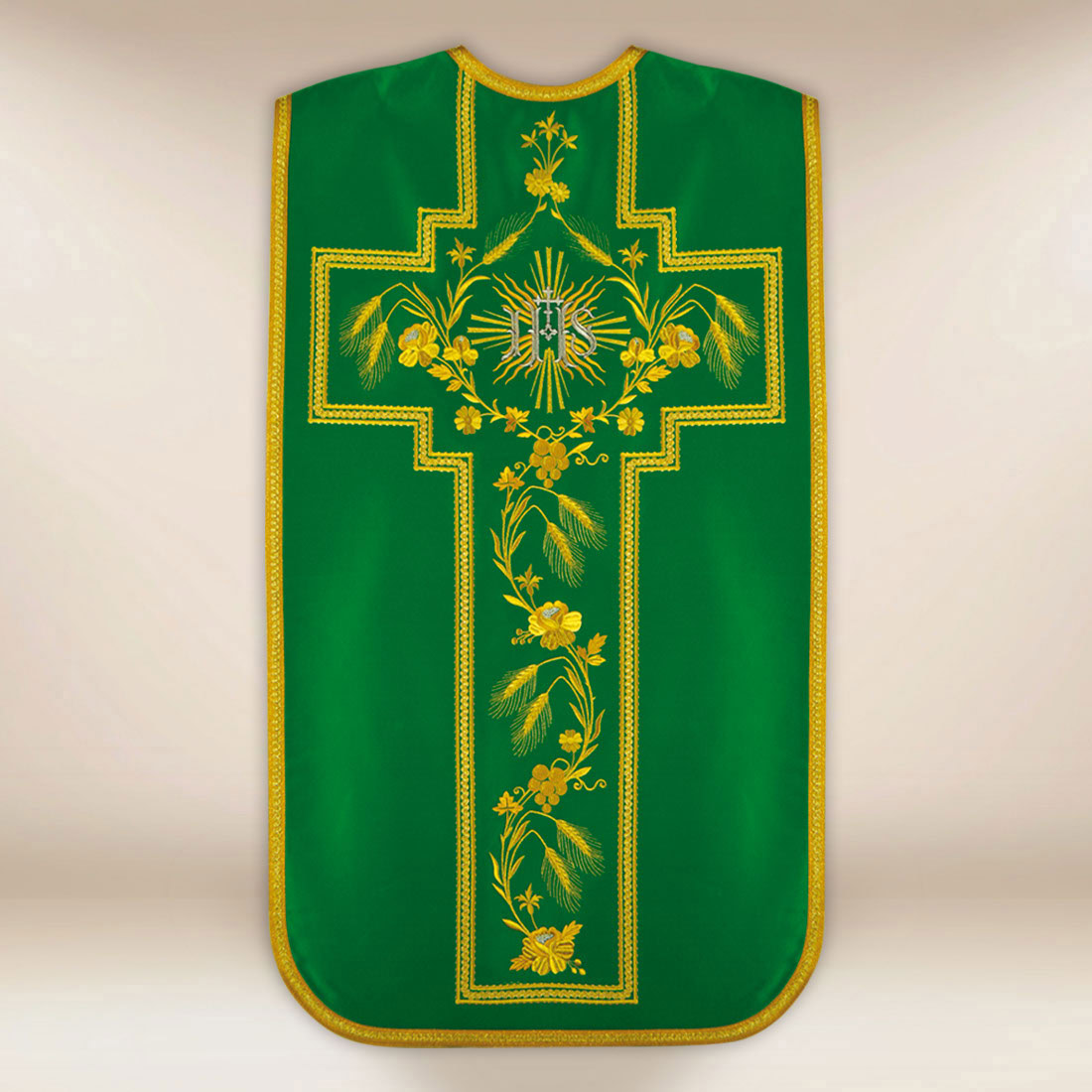 Elegant Roman chasuble IHS in green is a classic liturgical vestment intended for Ordinary Time.