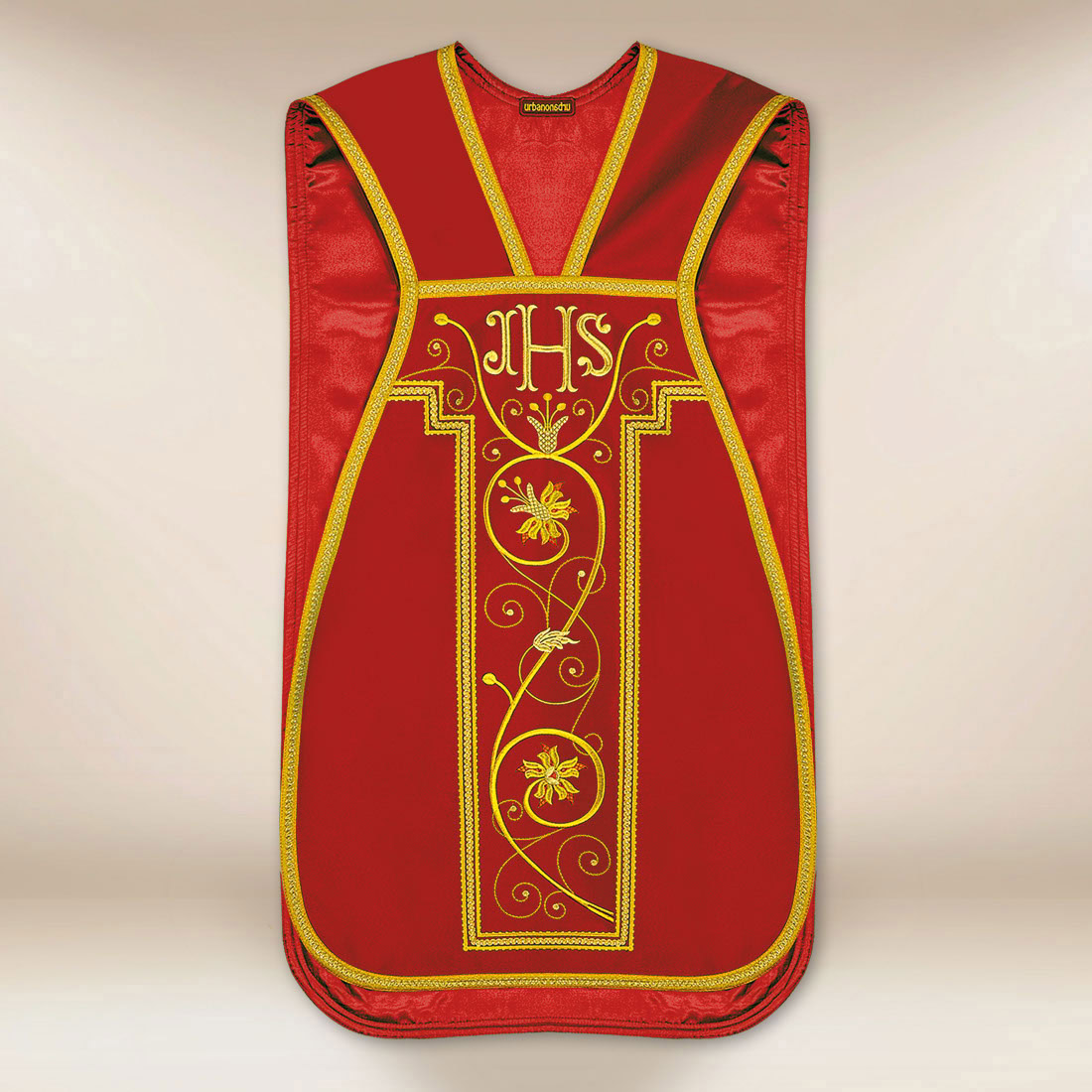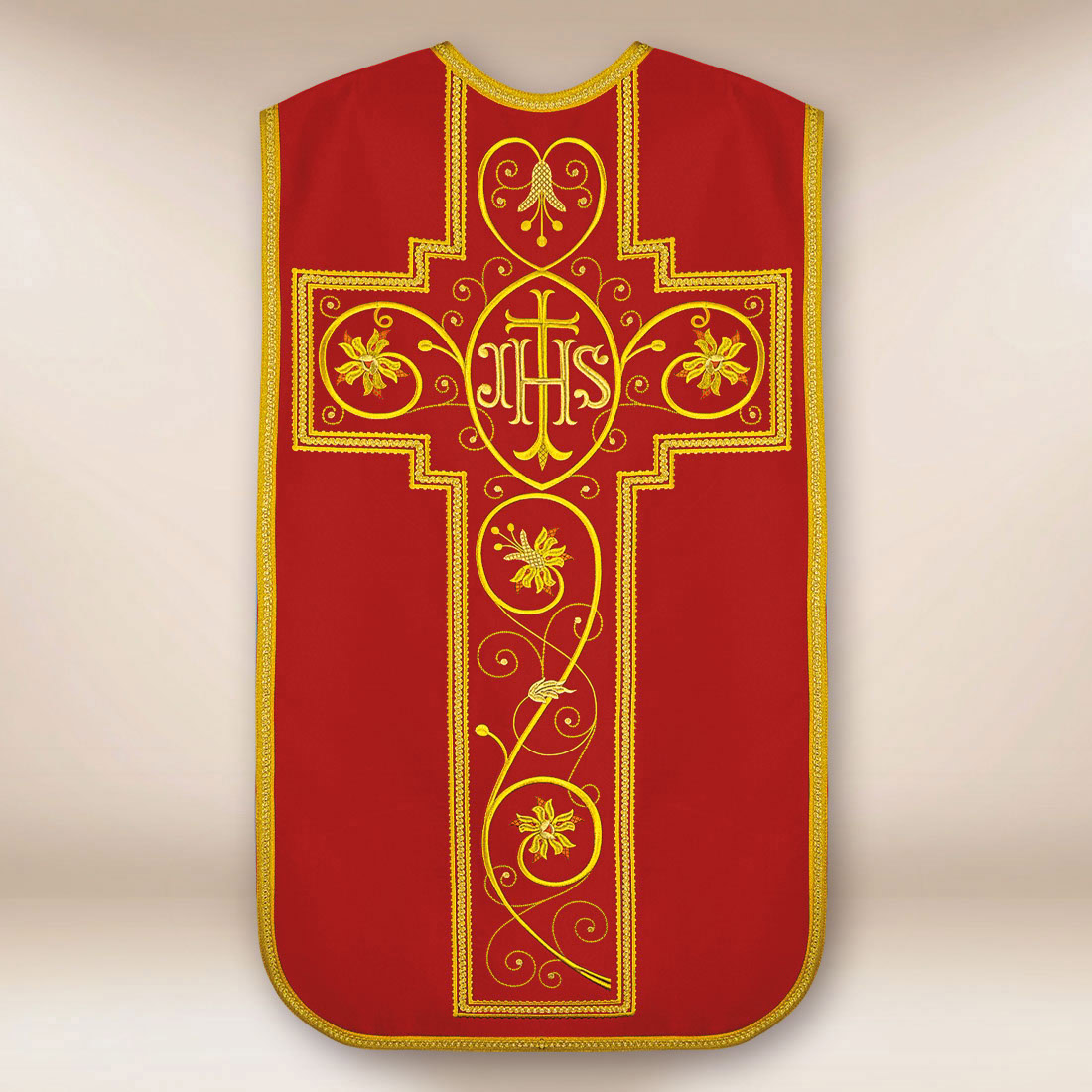Embroidered Roman Chasuble with IHS in red is perfect for solemn liturgical celebrations where the combination of vivid symbolism with traditional form is essential. The Roman cut ensures comfort in wearing and a natural drape of the garment, while maintaining the dignity of the priestly ministry.
