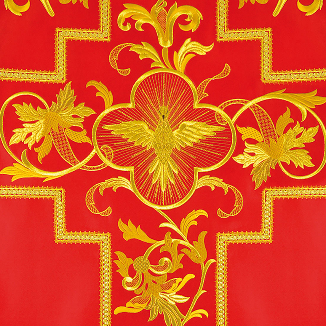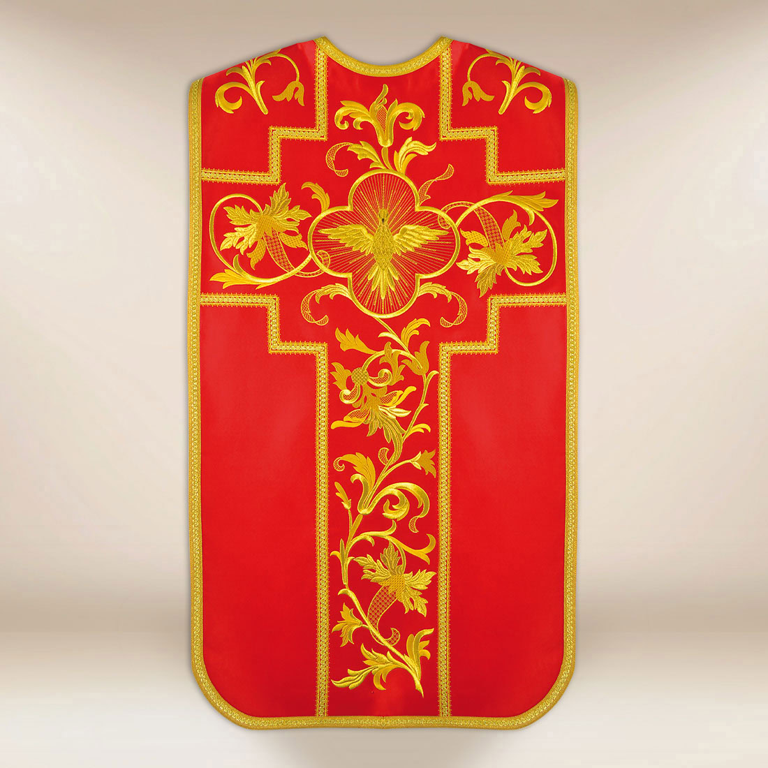 The central decorative element is an elaborate cross motif, running along the axis of the chasuble. At its heart is the symbol of the Holy Spirit, presented in a harmonious, ornamental composition that naturally draws attention and organizes the entire form of the garment. This motif provides a clear reference to the gifts of the Holy Spirit, His presence in the sacraments, and the guidance of the Church through the ages.