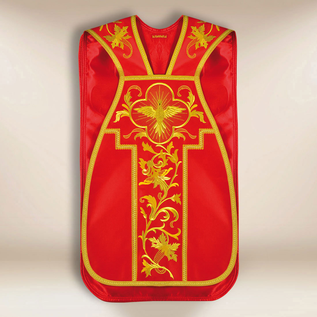 Urbanowicz Haft Polska – Roman chasuble with the motif of the Holy Spirit is a liturgical garment with a vivid yet deeply theological character, intended for celebrations that particularly emphasize the presence and action of the Holy Spirit in the life of the Church. The classic Roman cut gives the whole a calm, dignified form, faithful to tradition and clear in the space of the presbytery.