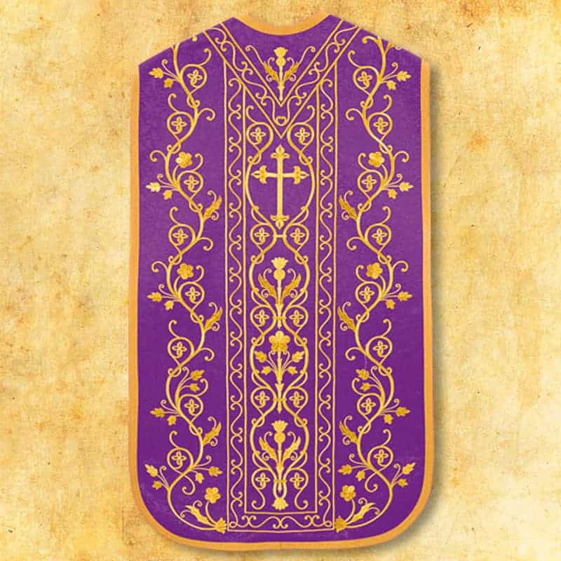 Fabric: “Jacquard”Colors: ecru, red, green, and purpleSize: universalThe set consists of: a chasuble, a stole, a veil, a maniple, and a bursa