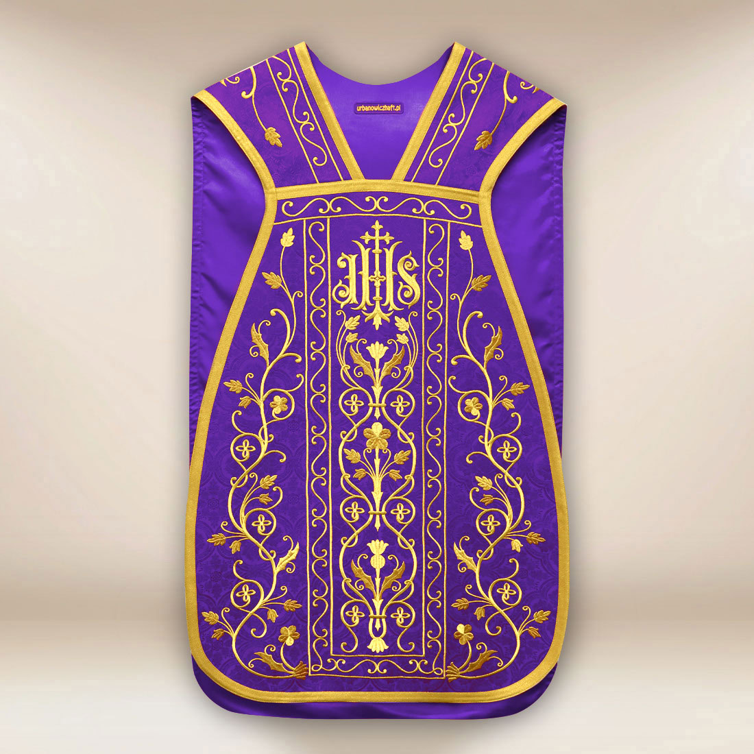 Urbanowicz Haft Polska – Roman chasuble embroidered in purple is a liturgical garment with a distinctly classic form, referring to the tradition of the Roman rite and rich symbolism of penance and expectation.