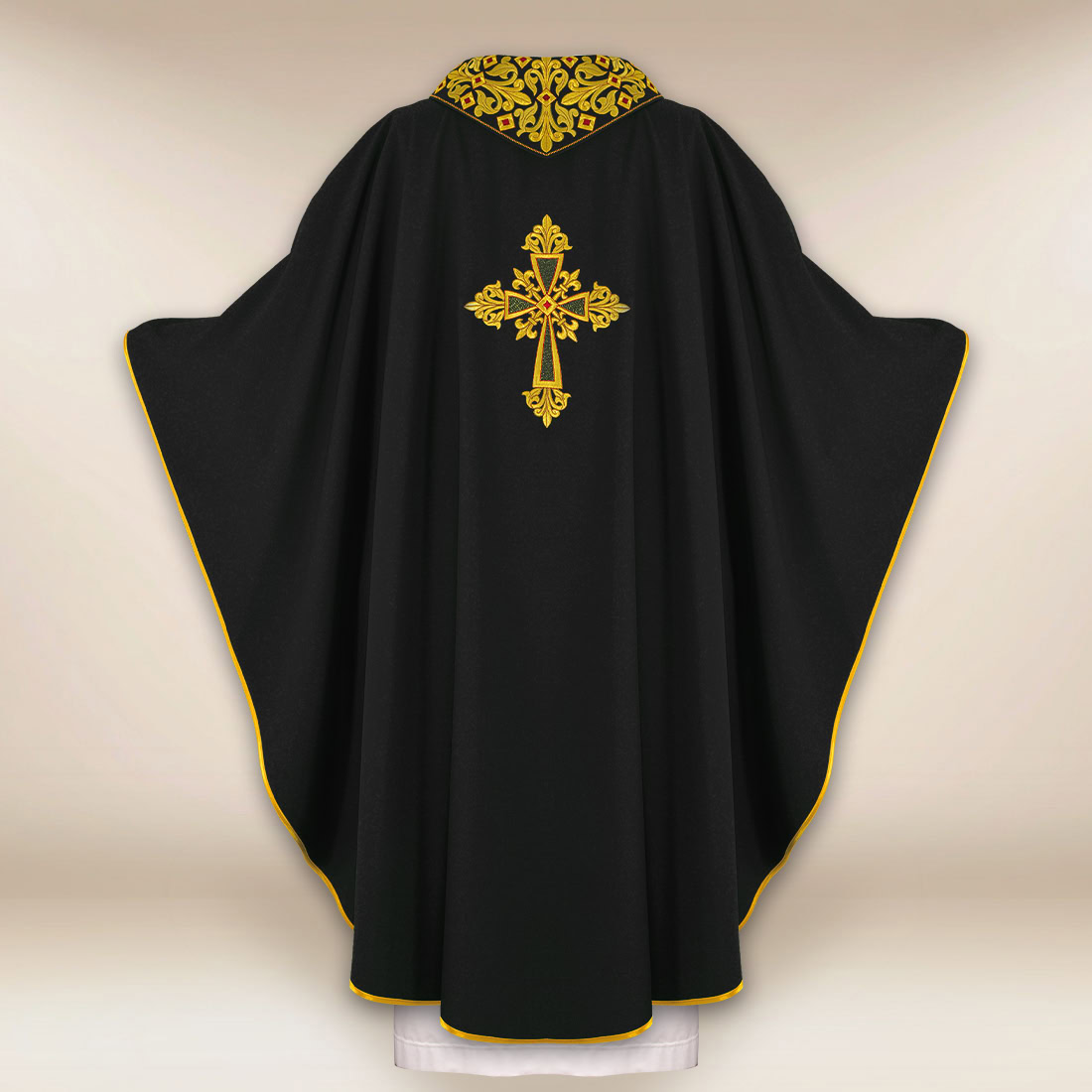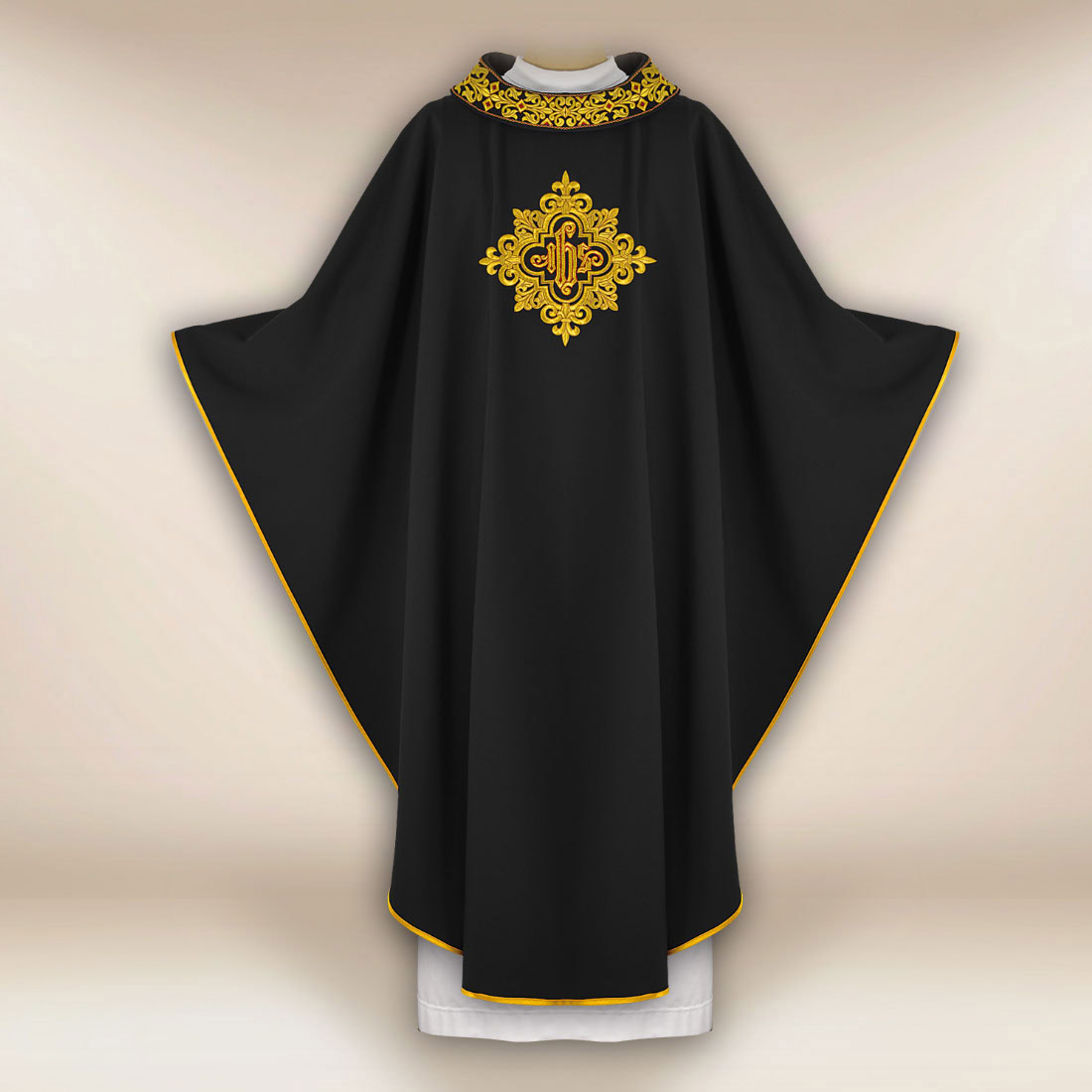 An elegant liturgical vestment in black with a richly embroidered collar with gold thread and central IHS embroidery, symbolizing Christ.