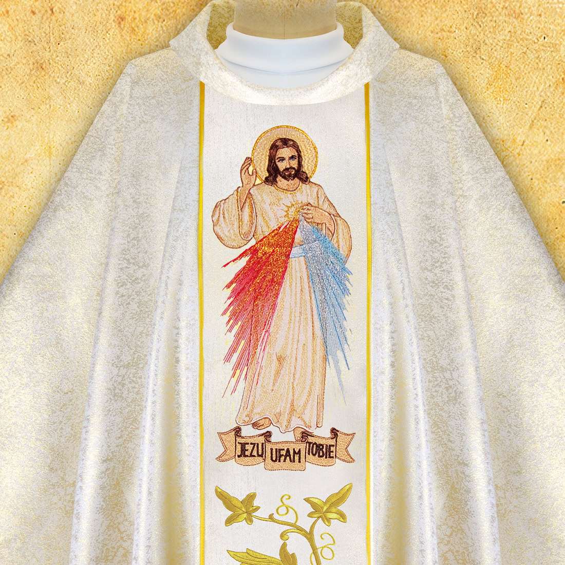 This chasuble, inspired by the image of the Merciful Jesus with the inscription “Jesus, I trust in You,” symbolizes faith, hope, and trust in God’s mercy – perfect for Divine Mercy Sunday and solemn celebrations.