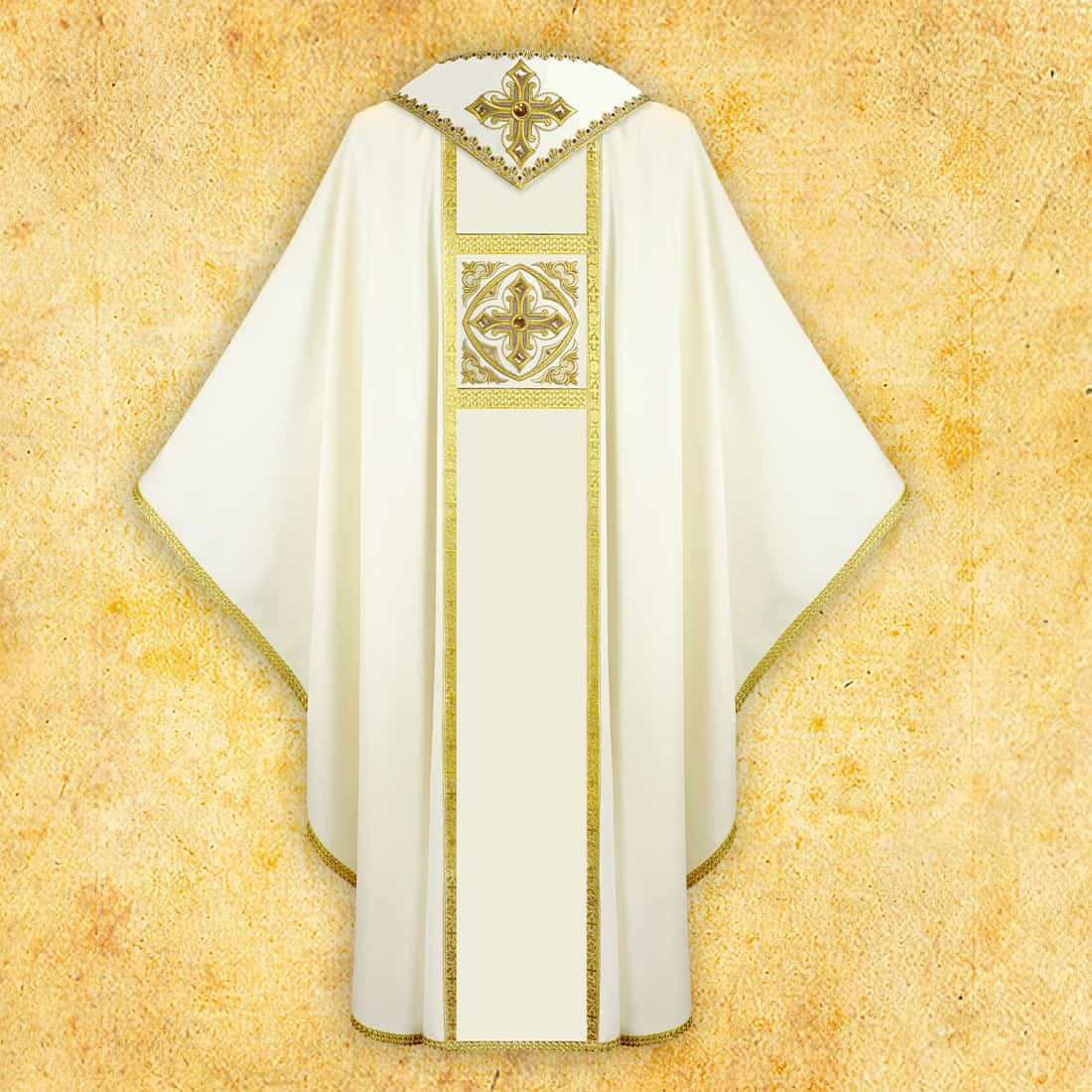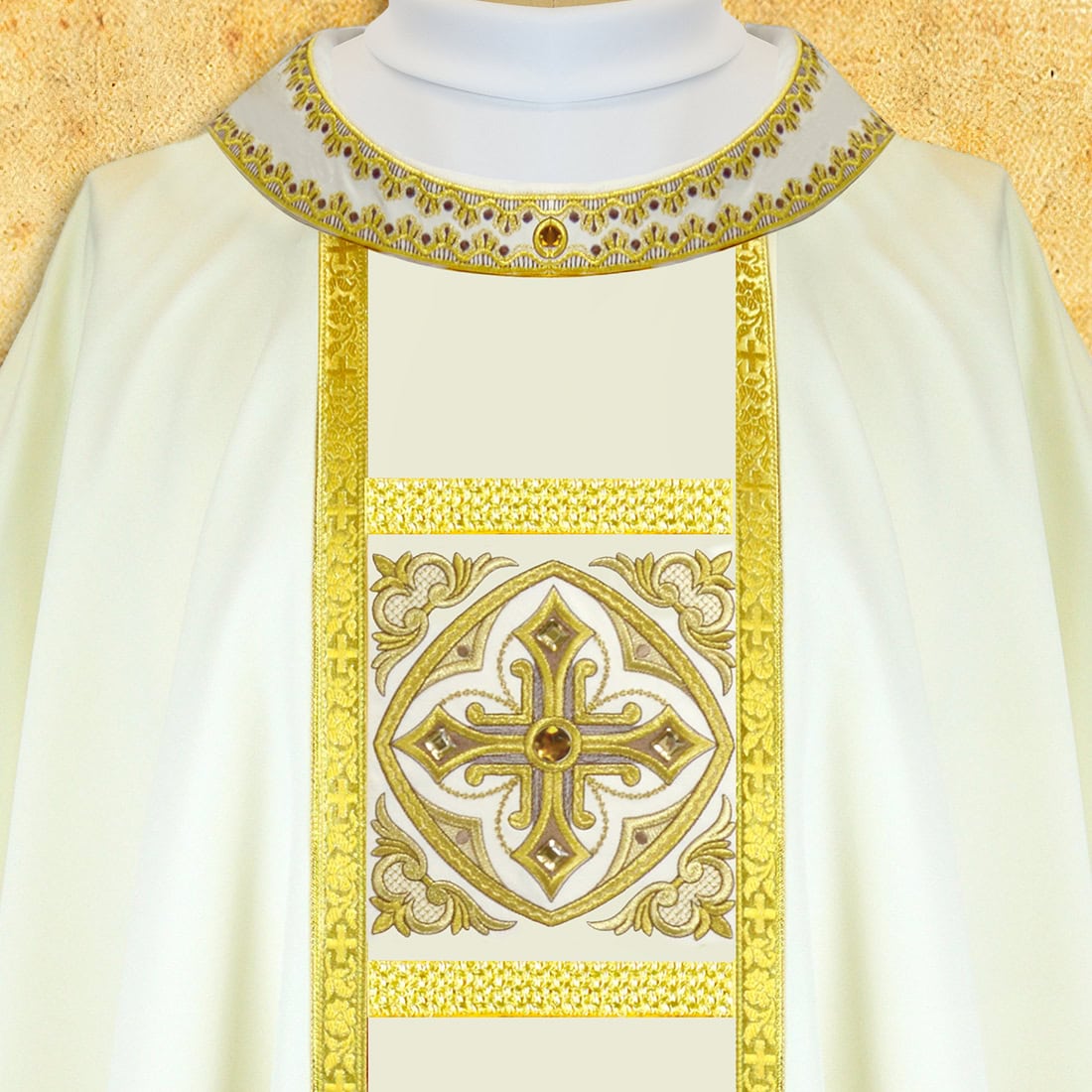 Embroidered liturgical chasuble made of high-quality “Satinowool” fabric. The fabric is soft, delicate, and elegantly draping, combining natural and synthetic fibers, thanks to which the chasuble drapes perfectly and ensures comfort during use.nThe chasuble is decorated with rich gold thread embroidery on the collar, braid, and stule, and the whole is additionally hand-decorated with stones.Its unique character is emphasized by Italian braided trimmings in the color of old gold.The set includes an inner stole, perfectly matched to the whole. The chasuble is available in one size fits all, suitable for every priest.