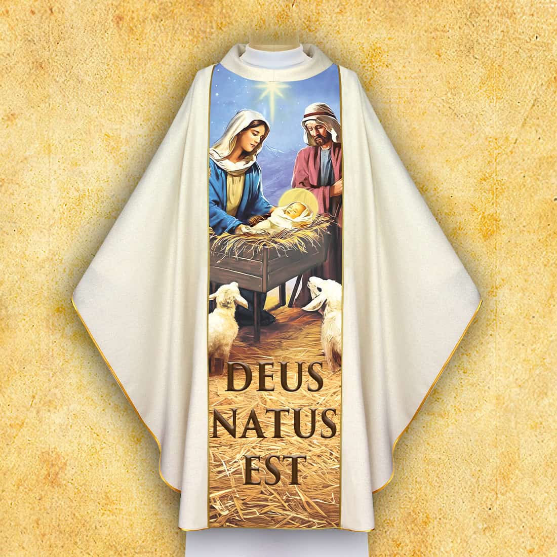 Chasubles made of high-quality Sacroline fabric interwoven with gold thread – otherwise known as papal fabric. The fabric is very pleasant to the touch, soft, light, and drapes well. The images on the bands are made using the thermosublimation method. Each chasuble comes with an inner stole. A veil for the chalice can also be purchased separately.Size: universal Length: 128 cm (+- 2 cm) from the shoulder to the bottom of the chasuble Washing: hand wash recommended at low temperatures