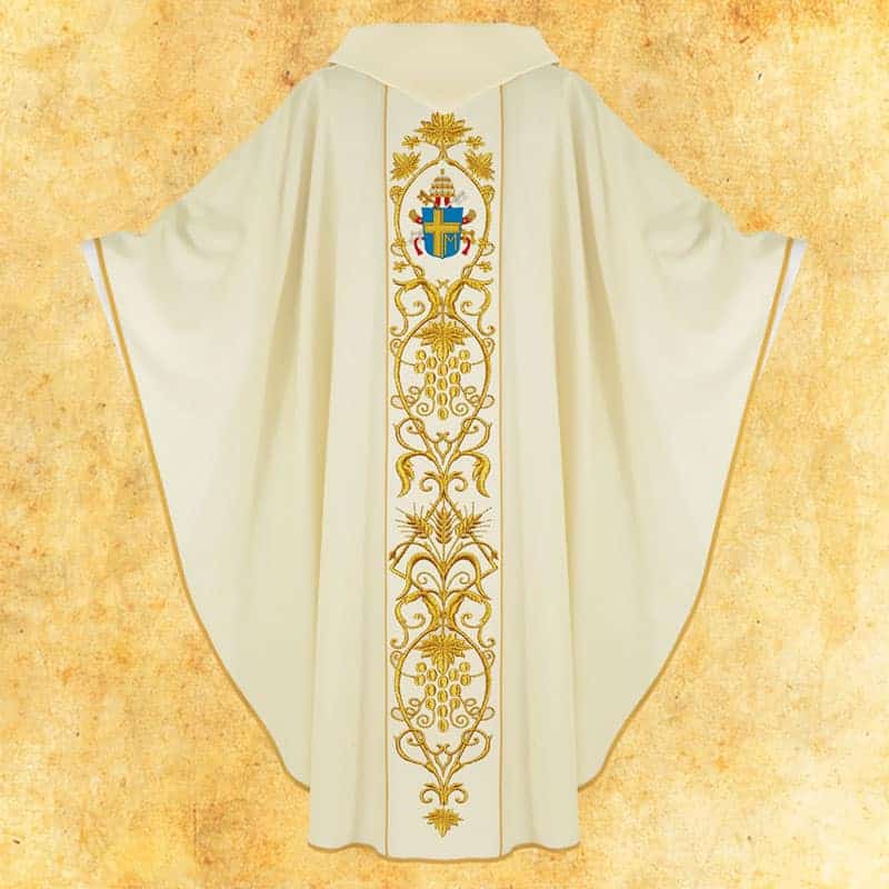 The embroidered “John Paul II” chasuble is a unique liturgical vestment inspired by St. John Paul II.nMade of high-quality fabric with a blend of natural and synthetic fibers, it combines durability with elegance.