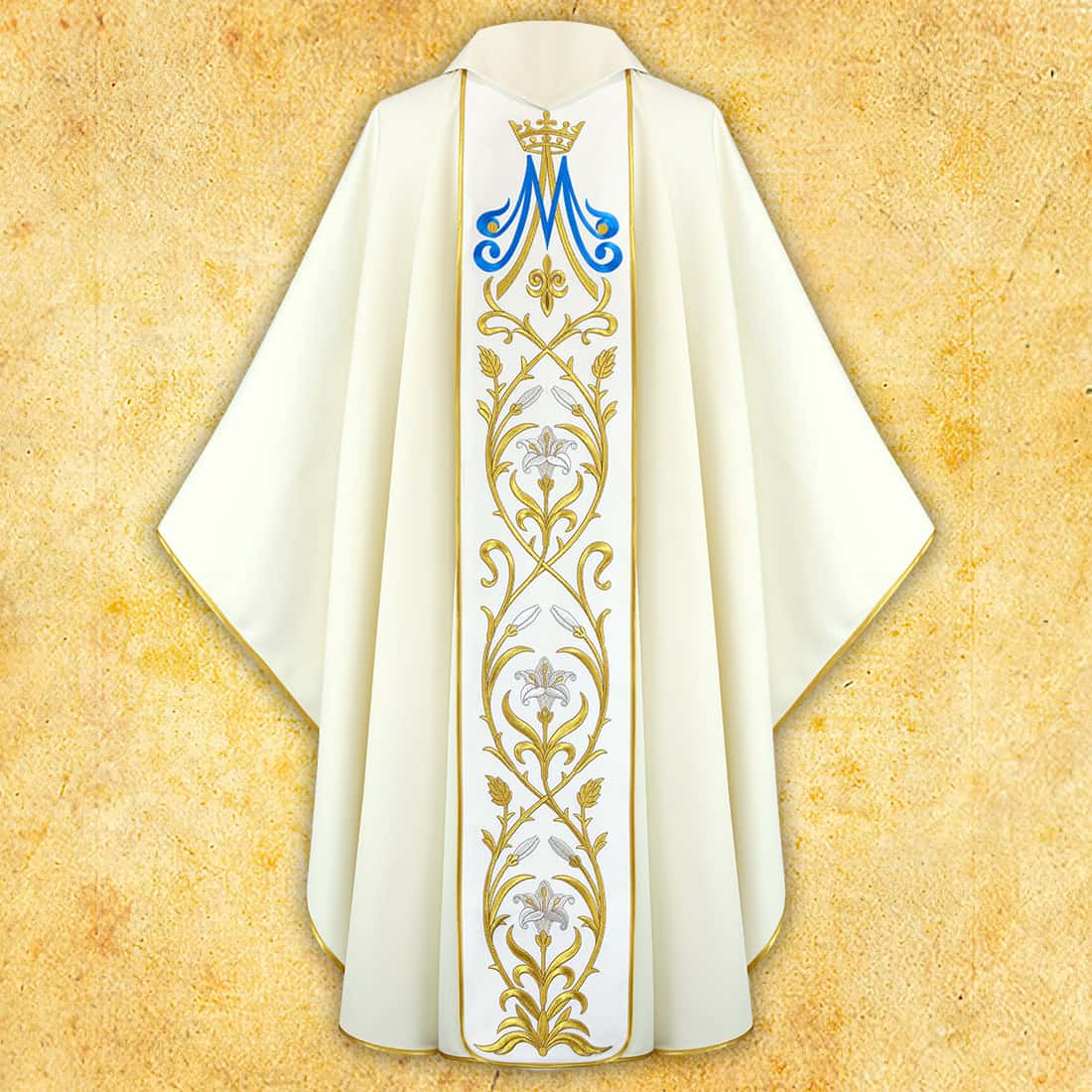 This Marian chasuble symbolizes the love and purity of the Immaculate Heart of Mary, making it the perfect choice for Marian celebrations, devotions, and liturgical feasts.