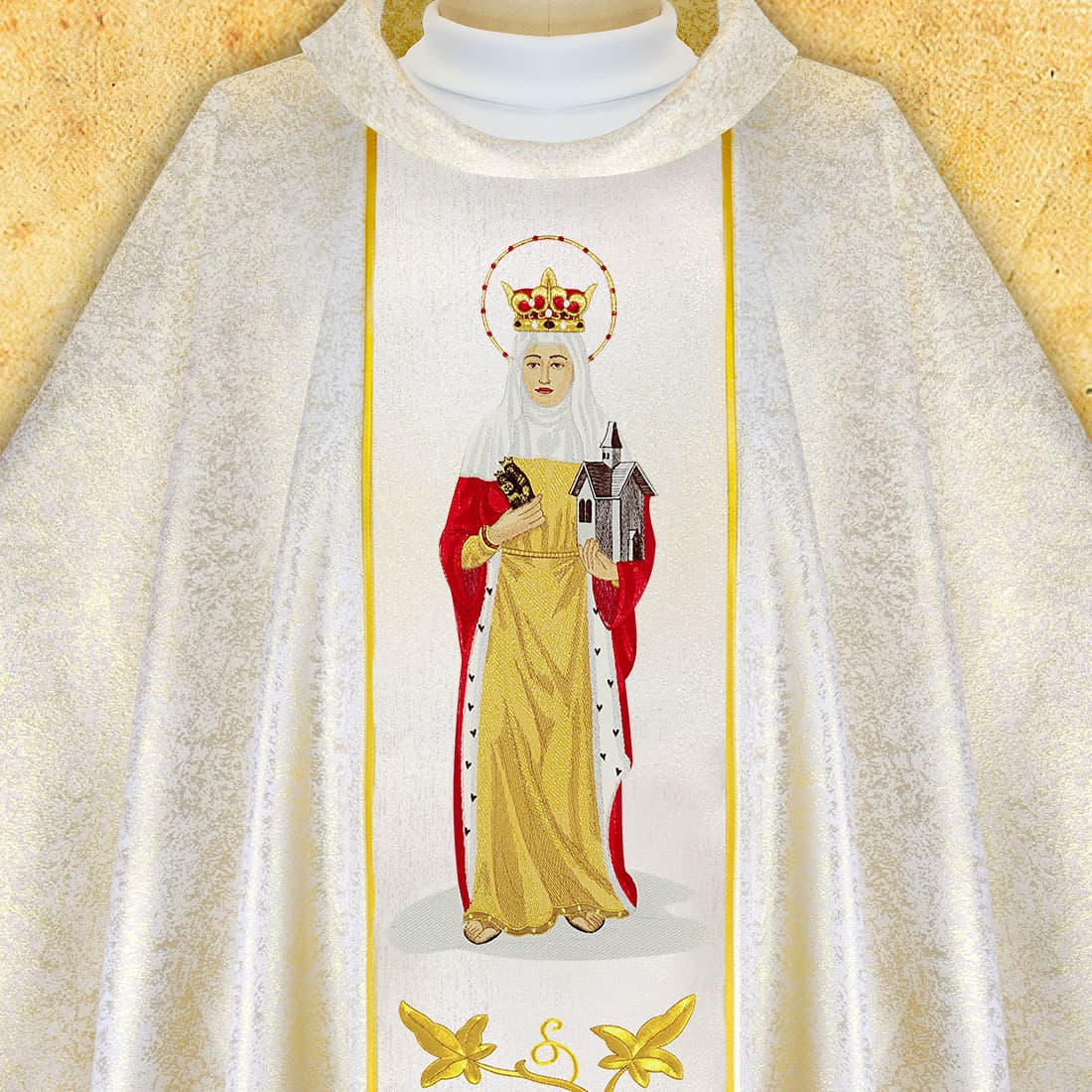 The embroidered “St. Jadwiga” chasuble is a unique liturgical vestment made of “Papal Gold” fabric in ecru, subtly shimmering with gold thread. The material is elegant, soft, and drapes beautifully, ensuring comfort and an aesthetic appearance during Holy Mass. />The ecru embroidered belt, delicately interwoven with gold thread, gives the whole a solemn and dignified character.