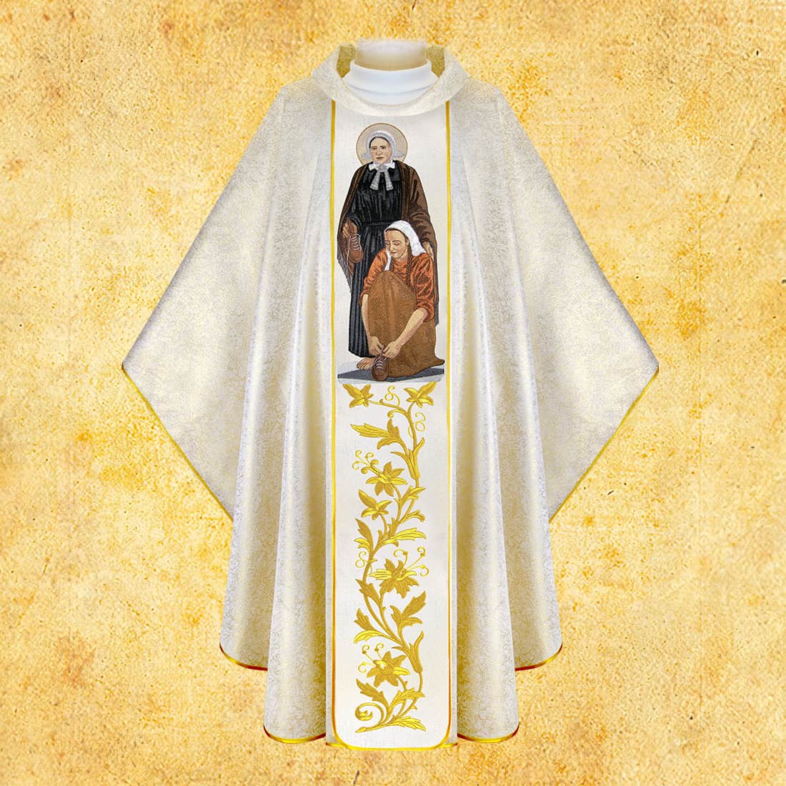 This chasuble, inspired by the figure of the Holy Mother Mary, is a symbol of humility, faith, and devotion, ideal for Marian celebrations and special liturgical feasts.