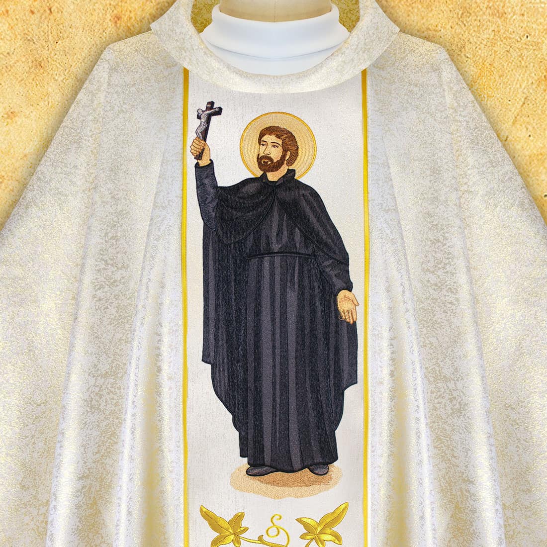 The embroidered “St. Xavier” chasuble is a unique liturgical vestment made of “Papal Gold” fabric in ecru, subtly shimmering with gold thread. The material is elegant, soft, and drapes beautifully, ensuring comfort and an aesthetic appearance during Holy Mass. />The ecru embroidered belt, delicately interwoven with gold thread, gives the whole a solemn and dignified character.