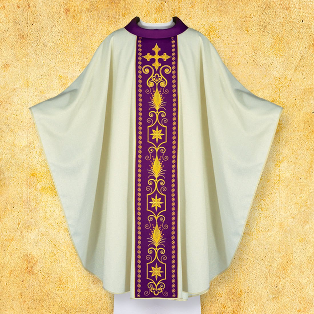 Liturgical chasuble in ecru, made of high-quality fabric interwoven with gold thread.The material is a combination of natural and synthetic fibers, including approx. 40% bamboo, which ensures lightness, breathability, and comfort.nThe chasuble has a sewn-in belt and turtleneck in the same shade, as well as an embroidered motif on the front and back.The set includes a matching inner stole.One size fits all – suitable for every priest.