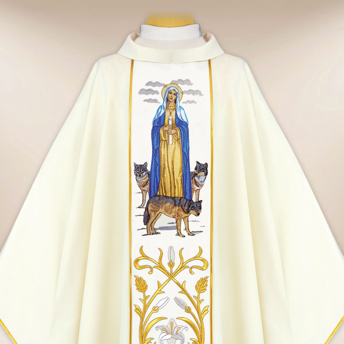 The material is soft, lightweight, and pleasant to the touch. It drapes well during movement, providing freedom and comfort throughout the duration of the Mass. The delicate texture of the fabric highlights its sacred character while maintaining the elegance appropriate for Marian celebrations. The embroidered band in an ecru tone interwoven with golden thread adds a subtle sheen and luminosity. The ornamentation is kept in a calm, harmonious, and legible form.