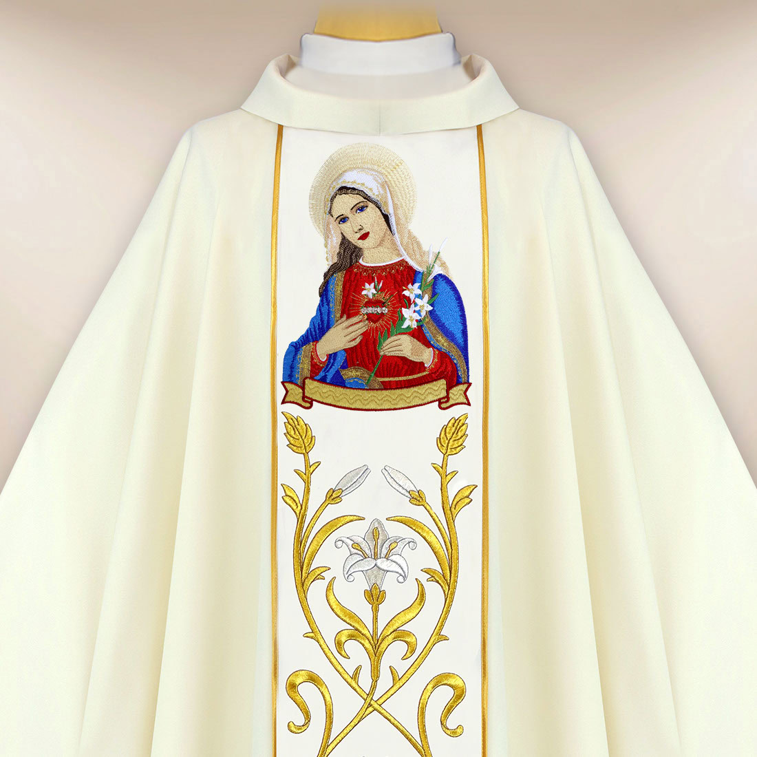 Embroidered Chasuble Heart of Mary is a liturgical garment that combines sacred meaning with elegance and a calm, classic design. The project, inspired by the spirituality of the Immaculate Heart of Mary, has been developed to emphasize the prayerful character of the celebration and to introduce an atmosphere of focus into the liturgy.