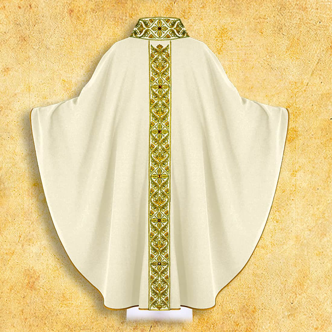 The fabric is soft, light, and exceptionally pleasant to the touch, thanks to which the chasuble drapes perfectly and ensures comfort during celebrations. The decorative stripes have been embroidered and hand-decorated with stones, which emphasizes the solemn character of the garment.gt;embroidered and hand-decorated with stones, which emphasizes the solemn character of the garment.