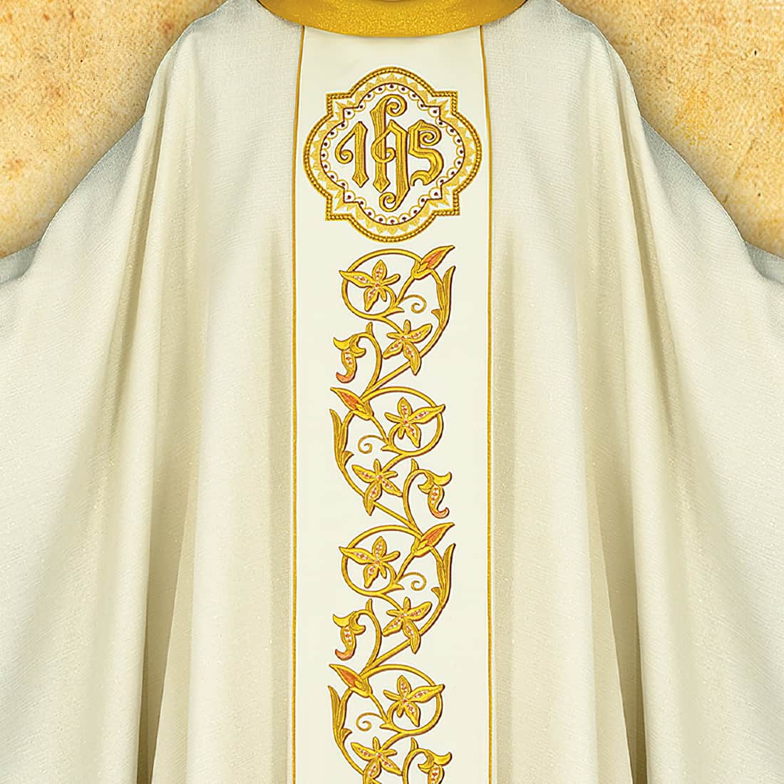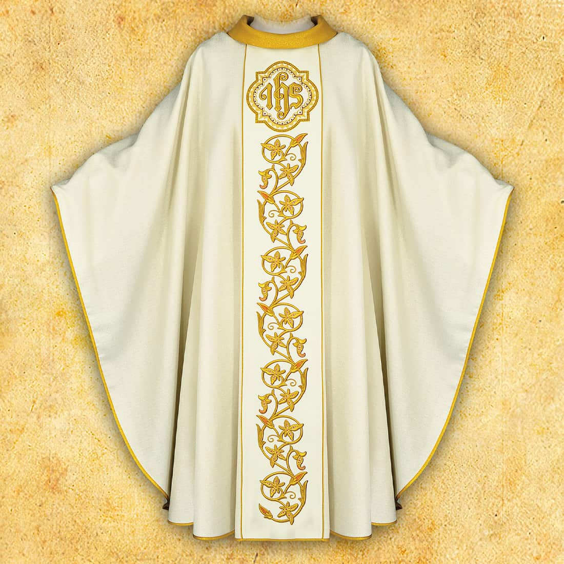 The ecru embroidered chasuble with IHS is an excellent choice for solemn Masses, processions, and liturgical feasts, emphasizing the exceptional importance of the celebration.