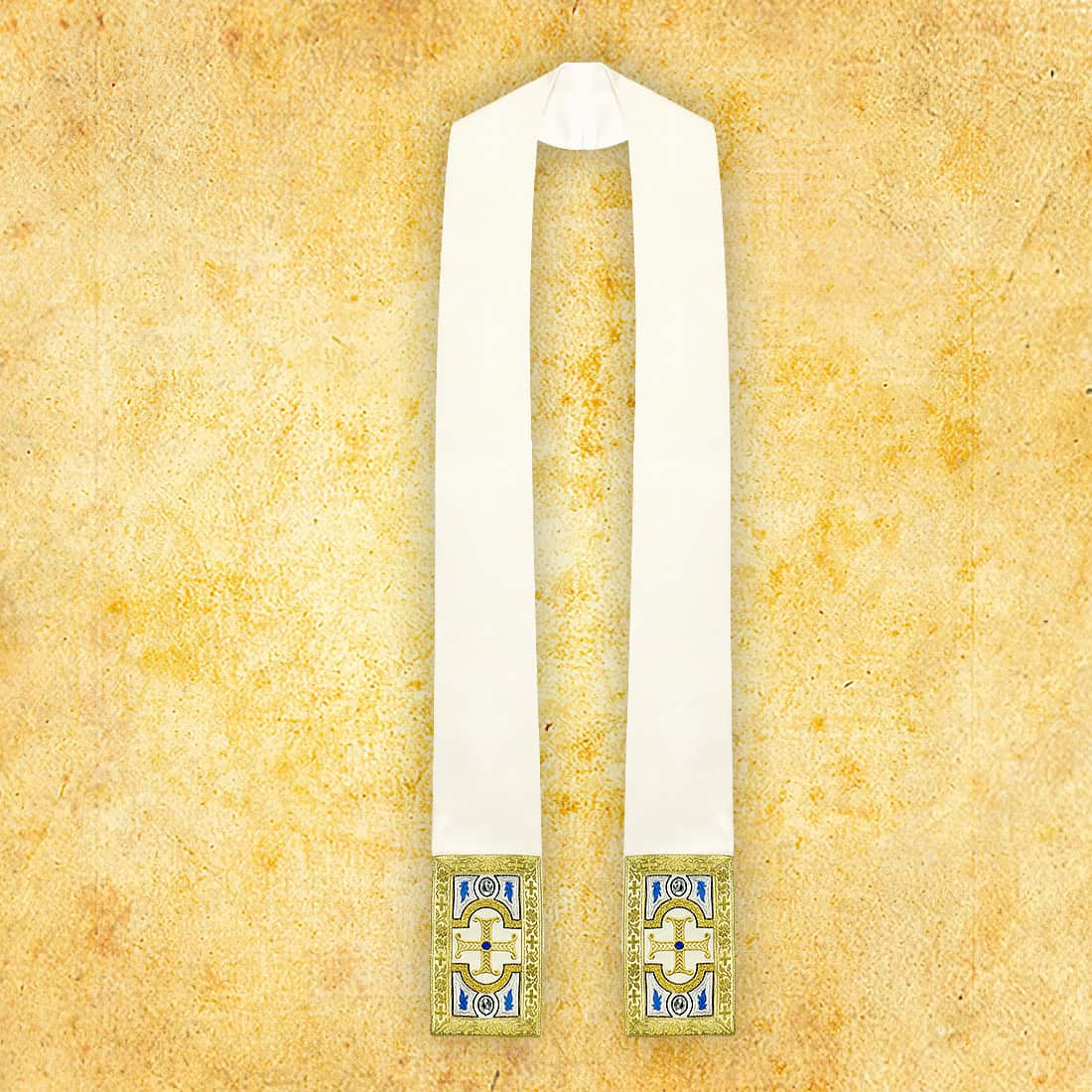 Embroidered chasuble with a Marian motif, made of high-quality jacquard fabric decorated with a classic lily pattern.The liturgical vestment is distinguished by rich gold thread embroidery, and every detail has been carefully finished with hand-made decorations using numerous stones. Italian braided trimmings in old gold add elegance to the whole, emphasizing the dignified character of the chasuble. The set includes a matching inner stole.nThe universal size makes the vestment suitable for any priest.This Marian chasuble is perfect for church ceremonies, processions, and Marian feasts, combining a sacred character with exceptional aesthetics.