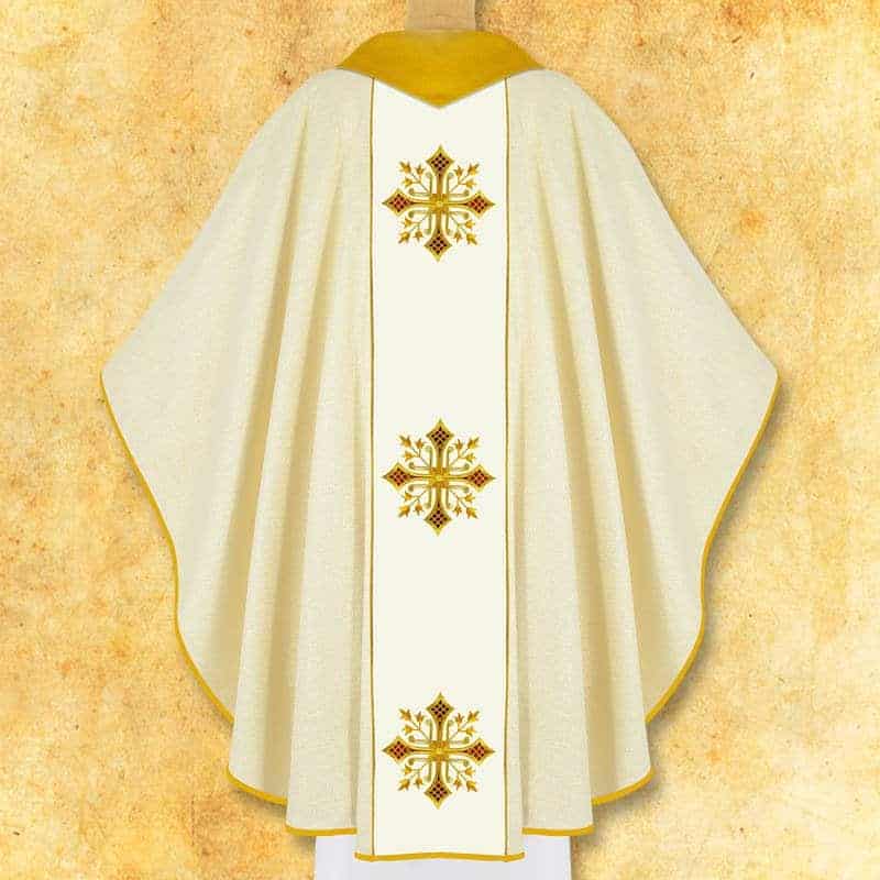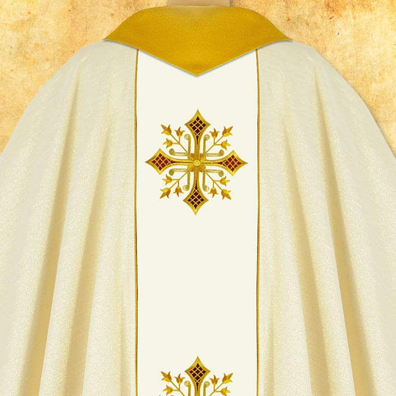 An elegant ecru embroidered liturgical chasuble is a unique liturgical vestment that combines tradition, spiritual symbolism, and modern craftsmanship. Made of high-quality fabric containing approximately 40% bamboo fibers, it combines lightness, breathability, and excellent durability. The subtle interweaving of gold thread gives the fabric a delicate sheen and elegant character, emphasizing the solemnity of every liturgical celebration. The ecru embroidered liturgical chasuble is the perfect choice for priests who value style and quality.The chasuble is decorated with an ecru embroidered braid, adorned with a cross motif, symbolizing Christ’s faith and sacrifice. The back features embroidery identical to the front, giving the garment a perfect look.gt;cross motif, symbolizing Christ’s faith and sacrifice. The back features embroidery identical to the front, giving the garment perfect symmetry and a harmonious appearance. The whole is complemented by a gold-colored collar, which emphasizes the solemn and dignified character of the robe, adding a unique splendor to it.n